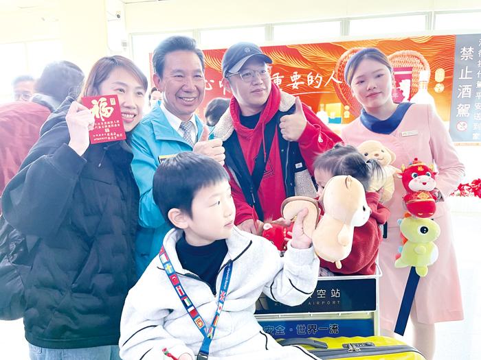 縣長陳福海13日上午親自前往尚義機場關心旅客運輸情況,並與副縣長李文良、縣府觀光處長許績鑫和金門航空站主任林義勇等人,在機場入境出口迎接旅台鄉親返鄉過年。陳縣長也在現場贈送福袋及馬年娃娃,祝福大家新春愉快,歡迎鄉親回來金門過年! 長達九天的春節假期從昨(14)日正式開始,13日一早尚義機場即湧現返鄉人潮,為迎接旅台鄉親返鄉過年,縣長陳福海當日專程前往機場,在副縣長李文良、觀光處長許績鑫、金門航空站主任林義勇等人陪同下,一起在機場入境出口迎接返鄉鄉親,並發放福袋、馬年娃娃,歡迎鄉親返鄉、分享過年喜氣。陳縣長也逐一向立榮、華信兩家航空公司、航警、聯合候補櫃台員工以及機場內各商家業者們致意及提早拜年,感謝地勤人員、航警等工作人員,犧牲春節與家人的團聚時刻,堅守崗位,使鄉親在旅運過程中享受優質的服務,讓鄉親實際感受到「回到金門真好」。 當飛機落地尚義機場,鄉親提著大包小包的行李,踏進機場時,陳福海縣長真誠又有活力的一句「歡迎回家!」頓時讓人暖上心頭。每位鄉親看到陳福海縣長與李文良副縣長親自在機場迎接,直呼好幸福,好有回家的感覺。而小朋友們人手一隻可愛馬年娃娃,笑得好開心,現場還有正義國小跳鼓陣帶來的「鑼鼓喧天慶太平」開場表演,現場氣氛充滿濃濃年味,相當熱鬧。 陳福海縣長熱情問候鄉親,贈送福袋,向大家賀節。陳福海縣長表示,許多金門鄉親平時在台灣各地打拚,為了生活努力著,春節是傳統文化中最重要的節日,也是家人團聚的美好時刻,很多鄉親都會選在春節回到家鄉,與家人們過新年,一大早特別與縣府團隊到機場迎接鄉親,就是希望旅台鄉親一落地金門,就能馬上感受到家鄉的溫暖。陳縣長指出,在航空運能方面,今年在縣府與各方努力協調下,已加開四波加班機,與往年相比,平均增加五千多個座位,希望讓金門鄉親都能順利返鄉過新年,在接下來的海空交通尖峰時段,會持續滾動式檢討運能及服務,盡力讓鄉親順利返鄉、平安返程,幸福過年。 李文良副縣長表示,在縣府團隊、民航站及金門商家等各方的努力下,今年的旅運量能有明顯提升,在金門及台灣各地的機場,都有縣府人員駐點服務,以協助解決鄉親的需求。李副縣長也表示,鄉親在春節期間,可以到林務所、水試所、畜試所及農試所等四所參加走春活動,除夕上太武山祈福,祈求全家來年平安,傍晚到雙口海灘迎接農曆新年前的最後一道陽光,還有大年初一晚上八點至八點半在烈嶼上林將軍廟的煙火施放活動,相信回到金門過年,絕對是驚喜滿滿。 金門航空站說明,航空站將自2月21日起,連續3天成立聯合補位服務櫃檯,提供旅客迅速便捷之補位資訊服務,減少無謂紛爭並維護機場秩序,同時協調臨時加班機以加速疏運旅客,讓每位鄉親都可以安心迅速返回工作崗位。