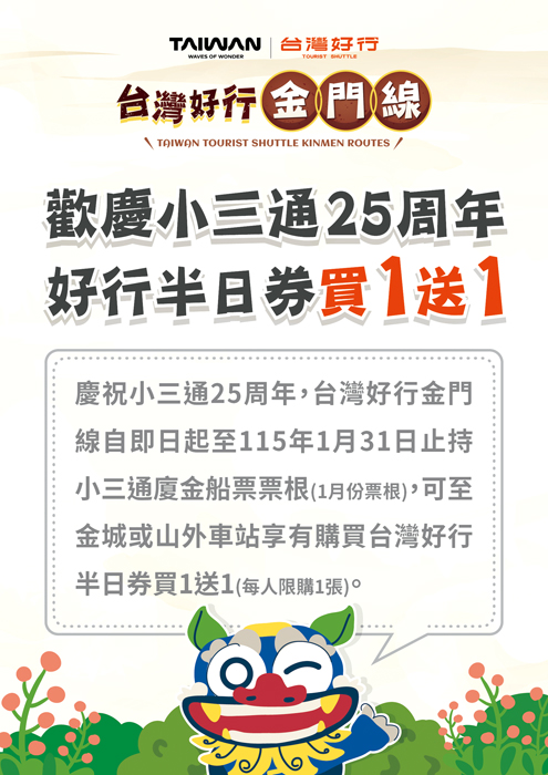 為歡慶金門與廈門「小三通」通行屆滿25周年,金門縣公共車船管理處特別推出旅遊回饋活動,針對深受旅客喜愛的「台灣好行金門線」,推出半日券限時「買一送一」優惠方案,邀請持小三通船票來金門的旅客,以更超值、便利的方式深入探索金門豐富多元的觀光魅力,體驗島嶼獨有的人文風采。 金門與廈門小三通自通行以來已邁入第25周年,長年扮演兩岸交流的重要角色,不僅大幅縮短兩地交通時間,也促進民眾往來、觀光旅遊與經濟互動。透過穩定且便捷的航線服務,小三通成為連結金門與廈門的重要橋梁,串聯起彼此深厚的情感連結,吸引越來越多國內外旅客經由小三通造訪金門,親身感受戰地歷史、閩南聚落、宗教信仰及自然景觀交織而成的島嶼特色。 為慶祝這項深具歷史意義的里程碑,並回饋長期支持小三通航線的旅客,金門車船處特別結合觀光公車品牌「台灣好行金門線」,推出期間限定優惠活動。自即日起至115年1月31日止,旅客只要持有小三通廈金船票票根(限115年1月份票根),即可前往金城車站或山外車站,購買「台灣好行金門線半日券」並享有買一送一優惠,每人限購一組,數量有限,送完為止,鼓勵旅客把握機會,以最輕鬆實惠的方式暢遊金門。 金門車船處表示,「台灣好行金門線」是專為旅客量身打造的觀光公車服務,透過完善的路線規劃與清楚的旅遊動線,串聯金門各大重要景點,讓不自駕的旅客也能輕鬆安排行程,減少交通轉乘的不便。目前台灣好行金門線共規劃7條主題式路線,涵蓋歷史文化景點、自然生態景觀、戰地遺跡以及特色傳統聚落等多元旅遊主題,旅客可依自身行程需求與旅遊興趣彈性選擇,深入體驗金門不同面向的魅力。 此外,台灣好行金門線車輛舒適、班次穩定,車上更安排專業導覽老師隨車解說,透過生動詳實的介紹,帶領旅客認識金門的歷史脈絡、在地故事與文化背景,讓交通移動不再只是單純的往返,而是一段充滿知性與感動的文化旅程,深受國內外旅客好評。 金門車船處進一步指出,此次配合小三通25周年推出的買一送一優惠,不僅希望吸引更多旅客搭乘台灣好行金門線,也期盼藉由公共運輸與觀光服務的結合,推動低碳旅遊,提升旅遊品質,讓旅客在輕鬆無負擔的行程中,深入感受金門獨特的島嶼風貌與人文底蘊。 金門車船處邀請持小三通船票來金門的旅客,把握本次限時優惠,善用台灣好行金門線,走訪金門各大經典景點,品味在地美食與文化故事,共同見證小三通25周年的重要時刻,留下難忘而美好的金門旅遊回憶。