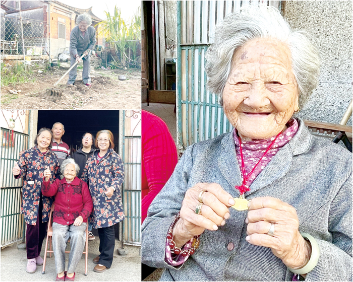 民國14年次的何張盤阿嬤,居住於金沙鎮浦邊村,她的一生可以濃縮在一句充滿堅毅的註解中:「一支蚵刀養活一家」。從幼時當童養媳開始,歷經艱辛歲月,憑藉著刻苦耐勞的精神和一雙勤勞的雙手,不僅成功養活一家,更將三子三女教育有成,現均服務於社會各階層。何張盤阿嬤於去(113)年榮獲金沙鎮模範老人殊榮,其樂觀、知足的生活智慧,深獲鄰里尊敬。鎮長吳有家讚譽其精神「值得我們學習」。 從童養媳到擎蚵婦:雙手打拚成就一家 何張盤阿嬤回憶,她出生後度晬,便被送到浦邊當童養媳。雖然童年生活艱辛,但她仍感念養父(公公)對她的疼愛。然而養父早逝,家庭的重責大任幾乎全落在她肩上。她婚後與先生胼手胝足,勤儉持家。阿嬤說:「我是一支蚵刀養活一家!」。她刻苦耐勞,無怨無悔,每日到海邊擎蚵、剝蚵,再徒步走到鄰近村落販售。談及這段艱苦歲月的心酸,阿嬤一度鼻酸眼眶泛紅,但想到後來18歲結婚,建立起自己的家庭,子孫孝賢,她便十分欣慰。她的努力和成就,讓她早在102年就榮獲金沙鎮模範母親獎。 長壽秘訣:生活充實、樂觀知足 已高齡101歲的何張盤阿嬤,身體狀態令人稱羨,她行動矯健、耳聰目明,目前生活仍可以自理。她每日的作息規律而充實,晨醒後必定先向家中神明上香。早些年腿腳比較好時,她還會走到蓮法宮上香,祈求境主黑旗將軍護佑。至於三餐吃什麼,阿嬤表示,她三餐「很隨意吃,有什麼就吃什麼」,肉、魚、什麼都會吃,從不挑食。她將現在的生活與年幼時「窮到只能喝地瓜湯的日子」相比,認為如今十分富足。 而阿嬤的日常生活中,持續的勞動是不可或缺的一環。她每日在門口一方農場忙碌,親手為一家人種植蔬菜。她說,種菜自己吃,有剩餘還可以分享給鄰居。女兒們形容,她身手矯健,上下台階自如,挖地種菜、除草還有種花,都不假他人之手。她晚間看電視累了就睡,作息順乎自然,沒有特別強制幾點休息。 多才多藝與社區奉獻 雖然何張盤阿嬤目不識字,但她展現了多方面的才藝和貢獻。生活的考驗,讓阿嬤練就「十八般武藝」,不但有很好的針黹,還會裁縫、織毛衣,子女們從小到大的衣服都出自她手。她生活勤儉,女兒詢問再為她買新毛線織衣時,她回說不用買,舊的毛衣拿來再利用即可。 此外,她具有良好的記憶力,能唱歌記誦古調,這些是她早期聽廟慶戲班演出學會的。她和鄰居下海採蚵時,總會應要求清唱歌曲,自娛娛人,也為辛苦的勞力活增添歡樂和詩意。 而除了照顧家庭,何張盤阿嬤還兼負助產士的工作,常幫忙村內的婦女們接生。更難能可貴的是,當鄰里有人面對生命終了時刻,她也會協助其穿壽衣,「見證生命的到來和離別,她淡定以對」。家人認為,正是這種不計較的付出與一生的辛苦,讓她贏得了尊敬和老天爺的眷顧,可以長壽而且健康。 六代同堂:全家人的福氣 何阿嬤形容,她的子女、孫子女都對她極好,「從沒對她大小聲」。兒子為照顧她,也從台灣回金門工作。她開朗、笑嘻嘻,被女兒們形容是「快樂的媽媽」,而且目前六代同堂。去年滿百歲生日時,榮服處偕團隊,縣長陳福海、鎮長吳有家等特地前往祝賀,讓她收到了第一塊金瑣片;今(114)年收到了第二塊金瑣片,她開心地掛在身上。子女們逗趣地說,阿嬤要一直收集,讓每位孫子一人一片,讓她哈哈大笑,盡顯家庭和樂。子女們說,阿嬤沒有特定的慶祝日子,母親節或逢年過節,大家一有空都會返鄉團聚在媽媽身邊,讓她開心。而家人們異口同聲地認為,阿嬤的健康長壽,是全家人的福氣。 鎮長吳有家於今年九九重陽節前夕,探視轄內高齡長者時形容,何張盤阿嬤總是笑臉迎人,和藹親切,即使早年生活艱難,但仍然很樂觀,十分難得。他表示,像她這樣面對生命的考驗和用智慧生活的精神,值得我們學習。 何張盤阿嬤用她一路走來面對生活難關的態度,完美詮釋了金門女性堅毅、樂觀、勤儉持家的人生哲學。