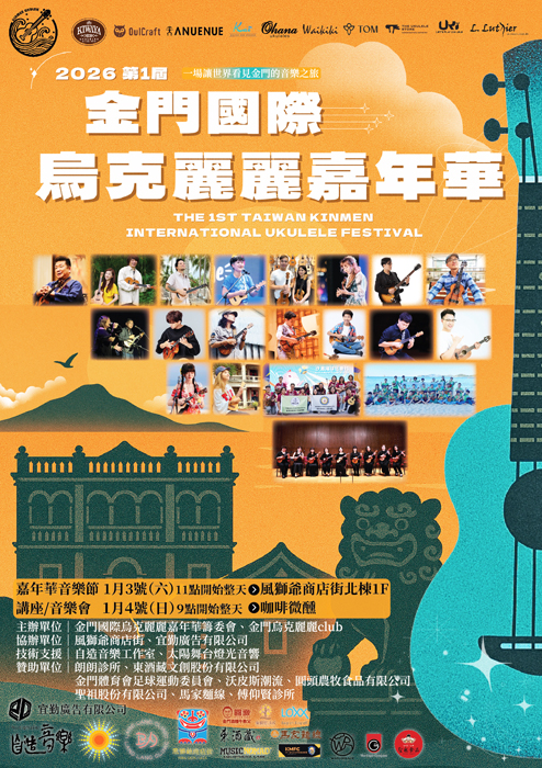 2026年初始,一場音樂盛典即將登場,由金門烏克麗麗club及金門國際烏克麗麗嘉年華籌委會主辦,首屆「金門國際烏克麗麗嘉年華」活動,即將在明(3)日登場,邀請來自國內外的知名烏克麗麗演奏家齊聚金門,帶來一場屬於音樂、熱情與交流的盛會,歡迎熱愛音樂的琴友以及民眾,共奏美好旋律。 第一屆「金門國際烏克麗麗嘉年華」將在1月3日(星期六)的早上11點開始,到晚間七點之間,音樂節將於風獅爺商店街北棟一樓熱鬧登場;而1月4日(星期日)則會在咖啡微醺,從早上9點開始,舉辦一系列的「特邀嘉賓專場音樂會暨講座大師班」,透過近距離的專場演出與深度講座形式,深化音樂教育與交流層面,讓學習者與樂迷能更深入理解演奏理念與音樂風格。嘉賓專場音樂會暨講座大師班的門票,可於1月3日主活動現場購買。 活動主辦的金門烏克麗麗club許翼騰表示,這場音樂盛事首次在金門籌辦,這是金門第一次以烏克麗麗樂器為主題所籌畫的音樂節活動,表演者匯集了國內外的優秀琴手,除了金門在地演奏者外,還有來自台灣、日本、韓國、越南、菲律賓、以及對岸的廈門、漳州等地的烏克麗麗演奏家,齊聚金門共譜悠揚的音符。 此外,活動現場亦規劃摸彩互動環節,邀請民眾透過完成指定互動任務參與抽獎。只要追蹤官方粉絲專頁與Instagram,並公開分享當日活動貼文,即可於現場兌換摸彩券參與抽獎,每人限領取一次;現場也設計簡單易上手的互動遊戲,讓民眾在欣賞音樂演出的同時能實際參與,提升整體活動的趣味性與互動感。 主辦單位表示,透過摸彩與互動機制,不僅是觀看演出還有機會獲得數把精選烏克麗麗及相關彩品,讓音樂體驗延伸至實際參與與收藏層面,使嘉年華在內容與形式上更加多元、豐富,也為參與者留下更深刻且具紀念性的活動回憶。 「金門國際烏克麗麗嘉年華」籌備多時,許翼騰希望烏克麗麗在金門所刮起的這股溫暖清新的音樂風,不僅串起了金門島內外無數的笑容與回憶,也希望讓金門的音樂故事,走向更廣闊的世界舞台,歡迎大家明日到風獅爺商店街北棟一樓參與這場音樂饗宴。 為確保活動品質與整體呈現,主辦單位整合多方資源共同投入,由風獅爺商店街與宜勤廣告有限公司協辦;自造音樂工作室及太陽舞台燈光音響擔任技術支援夥伴,協力打造兼具專業與親和力的演出舞台;同時亦獲得朗朗診所、東酒藏文創股份有限公司、金門體育會足球運動委員會、沃皮斯潮流、圓頭農牧食品有限公司、聖祖股份有限公司、馬家麵線、傅仰賢診所等單位的支持,共同促成這場音樂會。
