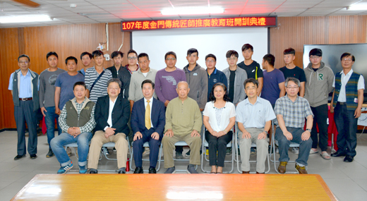 金門縣政府辦理的「一○七年度金門傳統匠師推廣教育班」開訓典禮昨(廿一)日假國立金門農工職校舉行,金門縣長陳福海主持開訓,第一期有二十名學員,由學員代表黃鏡霖向文化部登錄匠師李清海和金門大學建築系副教授曾逸仁等人奉茶,並帶領全體學員向老師鞠躬敬禮,完成「拜師」儀式後,他們踏上未來三年的學習課程,成為傳統建築匠師新血輪,讓閩南傳統建築修護技能及文化傳承下去,也讓兩岸、甚至世界看見金門閩南傳統建築文化之美的地方。 全國首創-金門縣政府辦理「107年度金門傳統匠師推廣教育班」開訓典禮,金門縣擁有四千餘棟的傳統建築,構成金門成為傳統建築風貌的文化重鎮。雖然金門國家公園管理處及金門縣政府自民國九十年起陸續投入傳統建築風貌的補助工作;但是對於匠師培訓欠缺一個長期的計劃,造成縣內傳統建築修復能量不足,或是修復人員欠缺傳統建築技能的問題。 為解決傳統建築修復人員年齡老化之窘境、厚植傳統建築修復能量及累積專屬金門傳統建築修復技能,金門縣政府特擬定「金門傳統匠師推廣教育班」培訓,並經過多次溝通說明獲得教育部核定同意納入國立金門農工職業學校的推廣教育計畫,進一步使金門傳統建築修復邁入新的里程碑,也是目前正規教育體系下與實務理論及傳統技藝技術結合的首創舉措。 金門傳統匠師推廣教育班開訓典禮於昨天上午舉行,陳縣長表示,金門有著豐富的閩南傳統建築文化,去到台灣或是大陸,就會發現金門閩南傳統建築文化是「寶」,要好好的保存及傳承下去;另,自然生態和戰地史蹟遺址、僑鄉文化,也都是金門的觀光發展寶貴資源。而且,他強調地方發展的過程,更應謹慎的去面對閩南傳統建築保存的課題。 今天,我們看到金門永續發展,要跟世界、兩岸三地競爭,金門有什麼可以競爭的?陳縣長表示,金門傳統的閩南建築文化就要好好的保護和延續,成為金門永遠的「寶」及重要文化資產,並且民間的、學術的、政府部門一起來看待及重視這個議題。 金門傳統建築修復技能,是一項永續的手藝和工作,陳縣長向學員保證,已責成建設處在草擬中的「匠師管理辦法」訂定相關規定,讓學員獲得證照後可以得到保障,勉勵大家共同把精彩的傳統建築流傳下去,厚植金門傳統建築修復能量。陳福海也表示,傳統的閩南建築是金門之寶,過去由於軍管時代,閩南建築得以保存下來,使得金門現在處處都是寶,希望產官學一起合作,累積專屬金門傳統建築修復技能。同時,他表示在國家公園內重要的傳統閩南聚落,能夠儘快的劃出外圍緩衝區,提供適宜居住環境,也保存需要保存的傳統閩南建築文化資產。 陳福海說,傳統匠師是保存傳統閩南建築最重要的一環,也透過閩南傳統建築賦予現代生活居住功能,讓閩南建築住起來更舒適和符合居住需求品質,也發揚金門傳統閩南建築文化,更讓世界看見金門傳統閩南建築美的地方。 縣府建設處長張忠民指出,金門傳統建築有四千多棟,完成修復不到六百棟,原因是缺乏匠師。金門大學建築系副教授曾逸仁說,缺乏匠師是整個台灣的問題,但全台沒有像金門有這麼龐大的傳統建築需要保護,金門市場相當大,培訓傳統匠師就從金門開始。 傳統匠師推廣班由國立金門農工執行,校長劉湘金說,雖然學校沒有土木群的課程,但很想為地區傳統建築盡點心力,因此接下這項課程;她有信心推廣班比大學相關課程更紮實,更盼能吸引年輕人投入,將傳統建築發揚光大。 縣府針對金門傳統匠師推廣教育班的培訓說明,係由縣府委由國立金門高級農工職業學校辦理之「107年度金門傳統匠師推廣教育班」招收學員人數共計二十名,訓練區分三階段;第一階段入門課程,規劃校內培訓三百六十小時、校外實作七百二十小時,總計一千零八十小時。金門農工實習處組長鄭蘄恩說,學員完成第二階段進階培訓後可以參加金門縣政府匠師考核認證,第三年培訓完成可參加文化部的全國傳統匠師認證。 另,匠師推廣班師資方面,除了曾逸仁外,還有金大土木與工程管理學系助理教授高志瀚;術科部分,有李清海和現代營造公司負責人陳榮文等人。 這次培育師資有金大建築系曾逸仁副教授、土木與工程管理學系助理教授高志瀚、中國科技大學建築系副教授閻亞寧等人講授基礎學科,術科並聘請獲文化部登錄傳統匠師李清海、薛芳乞、王承啟及執業匠師王天木、陳榮文、吳有泰、沈富春、李榮利、李榮興、沈澤庭、陳淮士及張建興等指導實作技術。第一期二十學員都是建築營造從業人員,每週六、日上課。由於這項課程是首次舉辦,學校表示將從做中學,隨時修正與調整。 此外,今年度「金門傳統匠師推廣教育班」培訓課程,旨以培養古蹟、傳統建築修復之基層人才為目標,在人才培育上著重於:一、培養學生識圖、製圖及測繪等基本能力;二、訓練學生具有古蹟、傳統建築修復之施工、監造及管理之實用技能;三、傳授古蹟、傳統建築修復技術方面相關法規與專業知識。四、培養專業道德與敬業精神,並具備良好安全工作習慣;期確保傳統建築的保存、修復,得以維持其文化風貌。