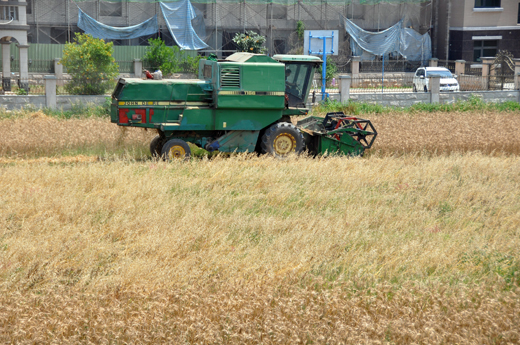 小麥收成,有請收割機。 趁著艷陽高照,收割機來回小麥田收割成熟小麥,又是豐收的一季。