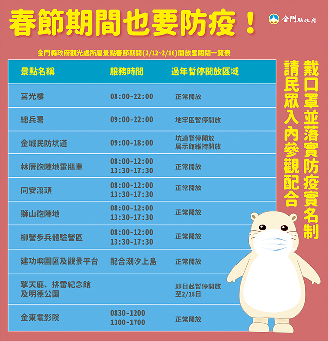 新冠肺炎疫情持續嚴峻,金門縣政府昨日宣布,為避免室內空間群聚,增加春節期間染疫風險,今年1月21日起暫停開放的太武山擎天廳,至2月18日前仍禁止參訪。 縣府指出,位於太武山花崗岩坑道內可容納上千人的軍事祕境擎天廳,因壯觀且渾然天成的景色,一直是遊客參訪的熱門景點,但受新冠肺炎疫情影響,自今年1月21日起暫停開放,由於目前疫情持續升溫,金門防衛指揮部已與縣府協調,為避免室內空間群聚,包括擎天廳、排雷紀實館及明德公園等,暫停開放時間將延長至2月18日。 縣府觀光處長丁健剛進一步說明,農曆春節期間(2月12日至2月16日)由該處業管暫停開放的景點包括總兵署地牢及金城民防坑道(展示館維持開放);其餘維持正常開放,縣府已加強消毒清潔作業,並擺放消毒用品供旅客使用,第一線服務人員均戴口罩並落實防疫實名制,後續將配合中央疫情指揮中心相關規定,適時檢討景點開放。