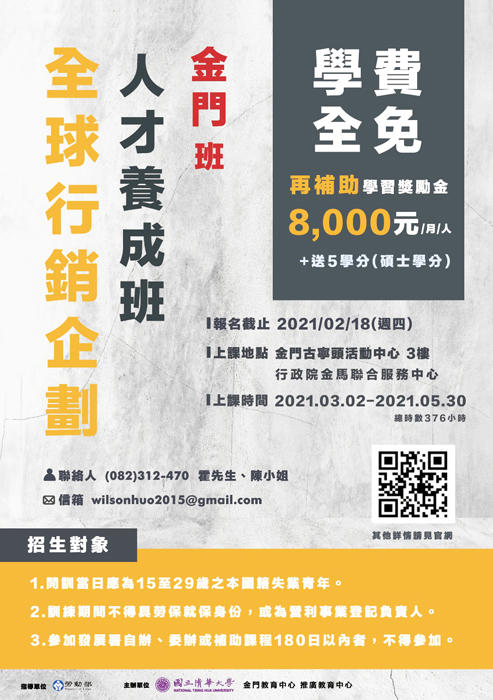 國立清華大學在金門開設「全球行銷企劃人才養成班-金門班」,報名資訊日前報導後立即受到鄉親廣大迴響,2月7日上午十時將再舉行第二次說明會,歡迎15至29歲本國籍青年報名參加。 國立清華大學針對疫情期間工作受到影響的十五至二十九歲本國籍青年(非金門籍亦可),並配合勞動部發展署之產業新尖兵試辦計畫,由清大擔負起照顧偏鄉離島因疫情期間受影響之青年,將在金門開設「全球行銷企劃人才養成班-金門班」,歡迎符合本計畫所訂年齡限制,且培訓期間無勞保之本國籍青年,踴躍加入本班學習第二專長。開班日期自3月2日(二)至5月30日(日),期間的週一至週日,上午九時至十二時、下午一時三十分至四時三十分、晚間六時至九時,共十三週三百六十小時。 清華大學表示,本期全球行銷企劃人才養成班-金門班的招生對象,須符合開訓當日為十五至二十九歲之本國籍失業青年、訓練期間不得具勞保就保身份,或為營利事業登記負責人,一百八十日以內有參加發展署自辦、委辦或補助課程者,不得參加。學費由政府補貼,並再給每人、每月八千元學習獎勵金,除此之外,清華大學再加碼給每位參加的學員五個碩士學分(該學分需學員擁有大學同等學力、且須考入清華大學並獲系所承認)。 全球行銷企劃人才養成班開課消息日前經報導,由於金門鄉親不斷來電詢問開課事宜,因此清華金門教育中心將於2月7日上午十點,假行政院金馬聯合服務中心(原福建省政府)舉辦第二次招生說明會,歡迎想報名的15至29歲本國籍青年親赴現場了解詳細開班情況與說明。第二次招生說明會報名網址: https://reurl.cc/o9DanD ;另外,若有事無法前來,亦可直接報名參加清華的全球行銷企劃人才養成班(金門班),報名網址為:https://reurl.cc/k0z1Mr 。若有任何疑問亦歡迎致電中心,洽詢電話082-312470。
