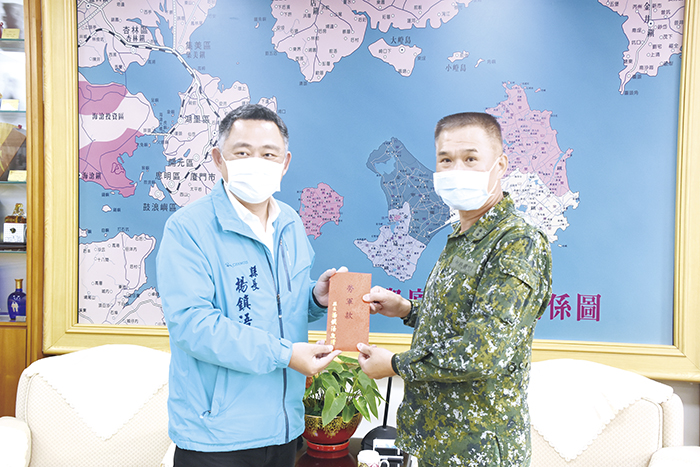 農曆春節將屆,縣長楊鎮浯昨天在縣長室會見陸軍金門防衛指揮部、陸軍金門地區支援營醫療連、金門守備大隊機步營、海巡總局第九海巡隊、中部地區巡防局第九海岸巡防總隊、空勤總隊第二大隊及衛生福利部金門醫院等單位,除了慰問戍勤官兵弟兄及工作人員辛勞,也提前祝賀國軍官兵新年快樂。 縣府指出,為防範新冠肺炎疫情,國防部已通令所轄各部隊避免於營區辦理勞軍慰問活動,加強人員管控,因此,在縣衛生局及縣府民政處的安排下,今年春節慰問活動特別做了些調整,邀請相關單位到金門縣政府做客,由楊鎮浯縣長頒發勞軍款及加菜金,希望在國內疫情持續升溫的此刻,也能用更安全的方式鼓舞官兵士氣,並同心協力攜手度過疫情難關。 這項春節慰問活動昨天下午3時起在縣長室進行,包括民政處長蔡西湖、衛生局局長李錫鑫、軍人之友社金門聯絡組組長陳偉棠等人也到場為官兵弟兄加油打氣,並由縣長代表全體縣民致贈陸軍金門防衛指揮部勞軍款新台幣6萬元,其餘單位加菜金各2萬元,感謝陸軍金門防衛指揮部保家衛國、協助防疫工作之辛勞。 甫結束馳援桃園姐妹市行程,特地趕回慰問官兵弟兄的楊鎮浯縣長,更代表全體縣民向陸軍金門防衛指揮部指揮官賀政中將、陸軍金門地區支援營孫仁駿少校、支援營醫療連連長孫凌龍少校、機步營營長曾紘齊中校、海巡隊隊長曾忠智、岸巡總隊隊長葉兆航、金門醫院副院長陳根雄及營養室主任李嘉根等人表達謝意,並期待在大家的努力下,疫情早日平息。 縣衛生局長李錫鑫也由衷讚佩國軍官兵弟兄的仁風義舉,包括金門守備大隊機步營每週二、五協助載送急重症病患軍機場搭乘C130赴台就醫;海巡支援二線烈嶼鄉病患夜間載運、緊急醫療轉診至金門醫院就醫及安寧返鄉等載運事宜;支援營醫療連長期支援本縣大型活動醫護及例行後送病患接送;岸巡隊積極查緝走私維護本縣治安。 此外,他更感謝金門醫院肩負金門在地鄉親、台商及旅客之醫療照護重任,以及空勤總隊協助本縣載運緊急傷病患空中運輸轉診作業的辛勞,他說,這些愛民助民的舉措,相信金門全體鄉親都銘感在心。