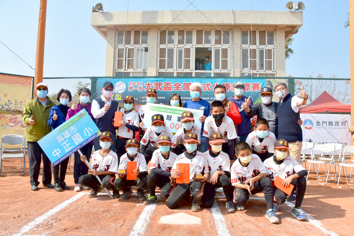 2021金門縣第一屆太武盃全國軟式少棒錦標賽22日於金門縣立壘球場開幕,歷經五日的球賽在26日上午畫下休止符。26日上午進行最後的比賽,季軍戰由嘉義大崎對宜蘭大同,冠軍賽則由高雄中正對高雄金潭,高雄中正靠著二局下的五分奠定勝基,提前5局以7比0獲勝,抱回團體獎獎金八千元。。 第一屆太武盃全國軟式少棒錦標賽22日起在金門縣立壘球場以及金門高中棒球場開打,來自全國十四支的少棒球隊齊聚金門,展開共二十四場次的比賽。26日只剩四隊比賽,決出冠軍後於下午一時舉行閉幕式,頒發獎盃給本次表現優秀的團體及個人。 26日下午一時在縣立壘球場舉行閉幕典禮,教育處長羅德水、金門縣體育會理事長唐麗輝議員、金門體育會棒球運動委員會主委陳滄江、金門縣慢壘協會主委陳向鑫、金城鎮鎮長李誠智、金城國中校長許維民、中正國小校長蔡雪芳、金寧中小學校長陳雅蘭、金馬聯合服務中心執行長翁明志等貴賓出席參加,參賽的前四強少棒隊領隊、教練、選手,以及裁判、大會工作同仁見證鏖戰多日的榮耀時刻。 羅德水感謝第一屆太武盃在體育會棒球運動委員會陳主委的籌畫下舉行,希望太武盃能繼續舉辦下去,能有後續的第二屆、第三屆……。由比賽的結果,可見金門少棒的實力仍有許多提升的空間,他期勉選手們一起努力,勝不驕、敗不餒。 唐麗輝恭喜得獎的隊伍,又打趣地說沒有給地主隊情面,獎盃沒留下一座。第一屆太武盃能有許多隊伍參與,對於金門而言是個好的開始,當然,籌畫本項賽事的陳主委居功厥偉。唐麗輝希望在未來幾屆的賽事能給地主隊一雪前恥的機會,希望下一屆也能見到本次參賽的選手們。 翁明志表示,雖然冠軍沒能留在金門,仍覺得高興,因為本賽事是項創舉,也舉辦得非常成功,好的開始是成功的一半,期許金門的棒球運動從此能輝煌的發展。舉辦錦標賽,獲取最多的榮譽固然是最大的目的,透過以球會友彼此切磋,相信大家因此交到不少好朋友,也從比賽中培養了運動員勝不驕敗不餒的精神,這才是最可貴的。翁明志期許所有的選手繼續努力,在下一屆取得更好的成績。 陳滄江表示,經過五天的鏖戰,決選出前四強,令他印象深刻的是選手們在每一場比賽拚戰的精神,以及在比賽中展現出的好品德,此即運動員的精神。恭喜得到前四名的隊伍,同時也對沒得到名次的隊伍致以欽佩之意;本屆比賽中,高雄中正國小得到冠軍,參與的金門中正國小與有榮焉。太武盃是個扎根的體育計畫,感謝教育部體育署、金門縣政府、金門縣體育會及贊助本次賽事的所有企業的支持,讓在外島舉辦的首屆太武盃能圓滿成功。陳滄江希望太武盃能繼續的舉辦,表示金門已辦了三次的青棒,這次辦的是少棒,希望今年夏天能舉辦青少棒,期望未來能在金門大學把棒球隊搞起來,將來弄個成棒。 第一屆太武盃全國軟式少棒錦標賽團體獎:冠軍高雄市中正國小、亞軍高雄市金潭國小、季軍宜蘭縣大同國小、殿軍嘉義縣大崎國小。 個人獎:大會MVP何牧(高雄中正);投手獎徐佑良(10局、2勝、自責分率0,高雄中正);最佳全壘打獎黃家偉(4支,大崎);打擊獎蘇子進(打擊率0.556,高雄中正);美技獎潘勝宏(高雄中正);教練獎尤伸評(高雄中正)。