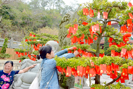 圖文/楊水詠 在農曆戊戌年春節期間,許多民眾趁著好天氣出外走春,也到太武山登高覽勝,並至海印寺朝拜禮佛祈福。在海印寺前廣場,寺方設置有許願樹給上山香客許願,掛著滿滿的許願卡,有許下「幸福平安、健康」,或是祈求「全家幸福運到」,也有許下在瑞犬年能夠「事事順心、賺大錢」,更有許下順利交到心怡的女朋友……,均希望在佛菩薩加持之下,所有心願皆能達成,瑞犬年行大運!