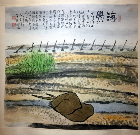 鄭善禧的金門情之「海鱟」為2015年遊金門所作。 根據鄭善禧畫記:海鱟——金門海上特有生物。海鱟,專家考據出現在三億多年前,至今保持原形,故稱活化石。漲潮時身埋沙中;退潮時出來覓食。晝伏夜出。要十三至十四年達性成熟。生於潮間帶。成鱟大都雌雄相隨。漁民捕之成對,謂之「一偶」。 據文化局說明:海鱟又名「馬蹄蟹」、「夫妻魚」,阿兵哥稱「鋼盔魚」,屬肢口綱劍尾目的海生節肢動物,被譽為活化石,是地球上最古老的動物之一。每當春夏季鱟的繁殖季節,雌雄一旦結為夫妻,便形影不離,肥大的雌鱟常馱著瘦小的雄鱟蹣跚而行,此時捉到一隻鱟,提起來便是一對,故享「海底鴛鴦」之美稱。