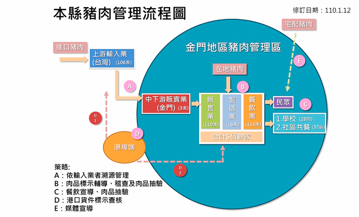 因應110年1月1日萊豬進口,為確保本縣鄉親食品安全,繼去年11月中旬、12月上旬縣府召開第一、二次工作小組因應會議後,秘書長陳朝金昨再邀集府內外相關單位召開萊豬工作小組110年第一次會議,共同研商完整的因應策略和積極做法,包括從食材來源、廠商及產地標示、各販售據點,設立各階段管理方法,全面為民眾食安把關,嚴防萊豬有絲毫模糊混入的機會,確保消費大眾的健康。 陳朝金指出,金門縣因應萊豬進口工作小組成立,一定要有積極動作,以朝風險管控降到最低努力,來符合縣民期待。對於空運部份,也建議透過調查,並找業者談一談。而加工品部份,建議衛生局在全國性會議提出,建請中央如何管理和形成規制。至於訊息流通方面,則請衛生局發布訊息時,各種管道都要兼顧。而社區和學校供餐部份,做好抽查和內稽表格建立機制,都要落實。 秘書長陳朝金指示,共餐據點應設置肉品檢查表,做好內控管理;針對市售豬肉及豬可食部位加強稽查抽驗,有關萊豬相關輔導、稽查、抽驗及宣導等資訊應多管道發佈公告,讓民眾知悉,各局處規劃及落實管理作為,進行風險管理,將危害降到最低。 陳朝金也提醒衛生局,對於肉品抽驗要連內臟也要取樣。港務處對於倉單標示清楚,也要再研究看看,並按商品管理規則來執行。並要拜訪岸巡隊,以相互幫忙配合。 金門縣因應萊豬進口工作小組110年第一次會議,昨日上午十一時在縣府第三會議室召開,由秘書長陳朝金主持,縣府相關局處主管和金門縣衛生局局長李錫鑫、副局長李金治及港務處代表與會。 會中,金門縣衛生局報告因應萊豬本縣工作情形。衛生局指出,為因應110年1月1日政府開放含萊克多巴胺豬肉進口,金門縣政府為捍衛縣民健康及權益,於109年11月18日成立「金門縣政府萊豬工作小組」,由秘書長陳朝金召集建設處、教育處、社會處、民政處、行政處、觀光處、港務處及衛生局,共同推動肉品來源安全管理,透過跨局處合作,從各環節阻絕萊豬進入民眾口中,用具體行動來守護縣民食安。 衛生局報告指出,地區有使用及販售豬肉及相關產品之製造業、販售業及餐飲業計571家,衛生局已輔導稽查標示754家次,今年(110年1月1日至12日)抽驗市售豬肉、學校及共餐據點共計36件,待檢驗結果立即公佈於衛生局網站,以供鄉親週知。 衛生局指出,本縣豬肉管理流程在策略上,A:依輸入業者溯源管理。B:肉品標示輔導、稽查及肉品抽驗。C:餐飲宣導、肉品抽驗。D:港口貨件標示查核。E:媒體宣導。衛生局指出,本縣輸入業之中下游販賣業者,有三家冷凍食品行,衛生局已列為重點查核對象,並請該業者提供所屬下游商家名單(21家),以確認流向資訊及輔導查核原產地標示。 金門縣衛生局已於官網設置萊豬專區,並透過FB張貼相關訊息,提供民眾資訊管道。而衛福部也設有豬肉儀表板,揭露臺灣豬肉與進口豬肉每日統計,食品藥物管理署於每日上午11時更新最新統計資料。 金門縣衛生局表示,目前無萊克多巴胺豬肉進入本縣。 有關萊豬禁入校園營養午餐議題,教育處也說明,在109年已完成召開「校園豬、牛肉原料原產地標示與平台操作說明會」、輔導學校於菜單中標註並張貼使用國產豬肉之公告,學校也已完成契約變更增加附約簽訂切結書納入契約規範並明訂罰則;今年持續要求學校落實食材驗收作業、菜單標註張貼使用國產豬肉,於「校園食材登錄平臺」登載豬原料原產地(國),預計於110年1月20日前完成。另社會處報告社區共餐33處預計1月底前完成社區共餐據點第一次肉品抽驗。建設處則輔導及查核農漁會販售之肉品標示,透過跨局處合作並邀請食品業者、農漁會、社區及學校等宣示拒用含萊克多巴胺豬肉,共同守護本縣消費者之食用權益及安全。 陳朝金強調,從110年1月1日起產製的食品含有豬或豬可食部位原料者不論是包裝食品、散裝食品或直接供應飲食場所供應的食品,皆應依規定明顯標示其豬肉及豬可食部位原料之原產地國,此為應辦之重大事項,一定要順利完成,並應宣導標示有行政院農業委員會核發之「台灣豬標章」、「台灣優良農產品」、「產銷履歷」及「生產追溯QR CODE」等認驗證標章者,如確實僅含有台灣豬肉或豬可食部位且符合該標章標示、使用及管理規範者,也得免重複標示其原料原產地,以簡化方便業者標示作業。 有關萊豬相關問題及資訊,可至金門縣衛生局官網「美豬美牛進口議題專區」https://phb.kinmen.gov.tw/Content_List.aspx?n=CD5D63166009496A查詢外,民眾若有相關疑問,亦可撥打082-330697轉305或310詢問。