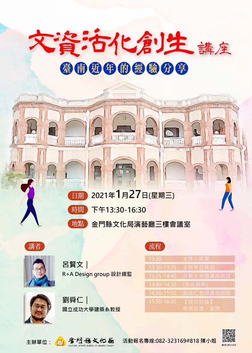 金門縣文化局近幾年積極推動古蹟活化再利用工作,透過古蹟與文創設計相互結合,期待能創造出更多文化資產保存與創生。本次預定110年1月27日(星期三)下午1時30分到4時30分於文化局演藝廳三樓會議室,舉辦呂賢文與劉舜仁「文資活化創生講座│台南近年的經驗分享」講座活動(見活動海報),活動全程免費,機會難得,歡迎公務人員、本縣文創業者、商圈或相關產業業者,以及有興趣的民眾踴躍報名參加。 報名日期訂於1月18日(星期一)9:00起,開放網路報名https://reurl.cc/xgZYME,報名人數80名,洽詢報名專線:082-323169#轉818陳小姐。 金門縣文化局指出,昔日古蹟修復較重視修復方式,但相較於如何活化探討較少,因古蹟等文化資產於直覺中似乎很難和創意與時尚有所衝突,而現今許多古蹟修復開始思考,如何透過創意導入使建物活化成新風貌,再創永恆不朽的經典之作。金門縣文化局特地邀請將歷史建築臺南知事官邸打造具時尚且不失文化的生活館的推手呂賢文進行經驗分享,生活館目前不僅推出居家生活選物、文創、仕女時尚商店、下午茶餐廳、酒吧,也推出進修課程,包括珠寶鑑賞、文學導讀、擺盤藝術等,成功吸引大批人潮前往參觀。 金門縣文化局希望透過他人經驗分享,為金門縣文化資產活化激盪出不一樣的火花,賦予每棟古蹟、歷史建築新的生命,重新塑造每個聚落的品牌特色,俾利文化創意能在金門每個角落開始扎根萌芽,為金門打造出具有自我特色的觀光文化創意島嶼,讓金門可以成為體驗文化、品味生活的精采城市。 呂賢文為國內知名建築師,畢業於國立臺灣師範大學國際時尚高階管理碩士在職專班,為R+A Design Group 總監、安提阿設計講堂創辦人、ANTIO傢物室創辦人、青年設計家聯盟執行長、臺南‧設計改變城市連線召集人、臺灣設計聯盟代表、25HRS設計實驗室創辦人、中華民國室內設計協會常務監事等。曾榮獲國內、外許多設計大獎,經典代表作包含臺南知事官邸生活館、榮獲2016 iF設計大獎的臺鉅美妝觀光工廠、榮獲上海金外灘獎的瓊觀等。 劉舜仁為國立成功大學建築學系及科技藝術碩士學位學程教授、C-Hub成大創意基地執行長,畢業於美國密西根大學建築學系。學術專長包含建築設計及都市主義、建築形態學、設計思考與理論、循環設計、臺灣鐵道建築遺產。其主持《鐵道藝術網絡計畫》更帶動了臺灣閒置空間活化運動。其著作《大象跳舞:從設計思考到創意官僚》一書更是探討龐大的政府組織如何可以跳脫框架、展現創意。目前擔任國際學術期刊International Journal of Design 以及 Athens Journal of Architecture 編輯委員,《設計學報》建築類主任編輯。 金門縣文化局特別提醒大家,為配合中央及金門縣政府防疫措施,敬請出席參與活動人員務必全程佩戴口罩,肥皂勤洗手,若有出現發燒、咳嗽或呼吸急促症狀,請勿出席參加。