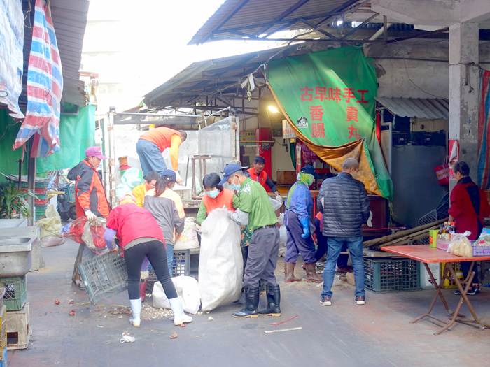 農曆春節即將來臨,金城鎮公所為提供消費者一個安心、衛生的購物環境,4日由鎮長李誠智親自帶隊整頓金門最大的東門市場,確保民眾「食」在安心。 李誠智表示,東門市場是金門經濟規模最大的傳統市集,但因年久失修,存有公安、雜亂等隱患,公所在縣府的支持下,預定在今年啟動東門中繼市場的整建工作,如果溝通、作業順利,預計在110年底就能給大家一個嶄新亮眼的傳統市集;但維護民眾食安及環境衛生卻刻不容緩,4日下午特別由環保課規劃辦理市場周邊環境整頓工作,確保提供消費者一個優質的購物環境。 環保課表示,為整頓市場環境,公所於年前即通知各攤商配合將需要的東西自行收拾妥當,並由環保課派員清理雜物及廢棄物、資源回收、疏浚附近溝渠,並進行主要道路的清洗及周邊環境衛生消毒等工作。 李誠智於巡視過程中,親自協助疏浚水溝,體驗清潔隊同仁的辛勞,他也請同仁注意工作安全,並呼籲鎮民趁著環境整頓時,將家中不要的東西盤點一下,如果有需要公所清潔隊協助清運者,可逕洽環保課(電話:082-325057)。
