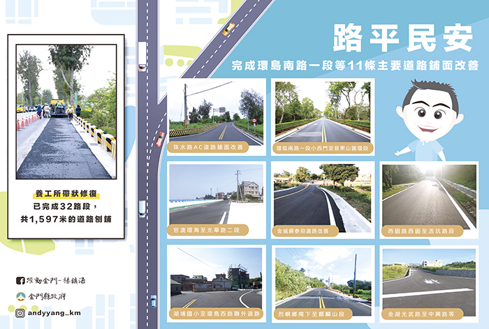 馬山建港評估規劃啟動 帶動東半島人流與經濟 面對逐年成長的小三通客運通航需求,為改善水頭港於通航旺季擁擠現況,縣府於108年完成「金門東半島多功能碼頭可行性評估」案,選址馬山西側海域增設金門國內商港第四港區,旋即辦理商港區域畫定作業,劃定成果並於109年底提報交通部核定。 「馬山港」主要功能為輔助經營小三通客、貨運,對接泉州石井港及備援未來翔安機場轉運旅客,以紓解水頭港區快速增加旅客量,平衡東西半島經貿發展;次要任務為提供東半島海上遊憩據點與緊急避風水域,也將納入符合多功能碼頭之使用需求,協助活絡地方經濟及促進產業轉型。 目前金門國內商港小三通客運雖以水頭港對接廈門五通港及泉州石井港,惟航班數量仍以往來五通港為大宗(約占八成以上)。相較於廈門市429萬人口,泉州市人口數已逾880萬人,且為福建省經濟活動最蓬勃地區。待馬山港正式營運後,推估每年市場運量約達74萬人次,估計可為金門地區帶來每年新臺幣近20億元的經濟產值。 調整路平施作策略 完成11條主要道路鋪面改善 這兩年縣府對於道路路面改善,採取兩種策略:主要路段的大面積修補,由工務處評估路面情形,分年分階段規劃重鋪。小面積修補,則由養工所負責。養工所的新型道路鋪裝機,於108年中開始投入路平專案,改變以往使用人力施工的方法,並由點狀修補改良為帶狀修復,進行一次性長路段路面刨鋪,較以往道路穩定性更好,路也更平;養工所這兩年已完成32路段,共1,597米的道路刨鋪作業。 在全島道路交通路網方面,為提供民眾舒適行車環境,縣府從108年至今陸續完成11條主要道路改善工程,包括「環島南路一段小西門至昔果山圓環道路改善」、「珠水路AC道路鋪面改善」、「西園路西園至浯坑路平改善」、「官澳環海至光華路二段道路改善」、「金城鎮泰仰道路改善」、「金湖鎮光武路至中興路等道路改善」、「金寧鄉湖埔國小至環島西路聯外道路改善」、「烈嶼鄉庵下至麒麟山段道路改善」、金寧鄉「頂林路等路面改善工程」、金沙鎮「環島北路至高陽路聯外道路工程」及金城鎮「金山路鋪面改善工程」。另外109年度還有金湖鎮「黃海路等道路改善工程」、「金城鎮城區路平改善工程」、「1-1道路新建工程」等許多案件都正進行施作中,提升鄉親生活圈周邊的道路品質。 110年也將持續推動路平,例如環島北路二段、西海路二段及瓊徑路等路面改善計畫均已啟動,並將爭取中央經費執行。 3鄉鎮新建4座停車場 將增加1,034席停車位 隨著地區家戶汽車擁有數的上升,停車問題的解決也是楊縣長精選政見中想優先解決的問題之一。各鄉鎮城區停車場,縣府已規劃在金城鎮興建「中正國小」和「金城國中」地下停車場,在金湖鎮「市港段83地號」興建立體停車場,在金沙鎮興建「金沙國小地下停車場」,並已獲中央核定近十一億元的前瞻經費補助。 中正國小停車場:將提供308席汽車停車位,目前規劃成果審核作業中。 金城國中停車場:預計提供286席汽車停車位,目前基本設計成果審核作業中。 金湖市港段立體停車場:預估提供190席汽車停車位、80格機車停車位,目前先期規劃期末報告審核作業中。 金沙國小停車場:預計提供250席汽車停車位,目前基本成果審核作業中。 以上四個停車場,將於113年完工,可有效解決違停亂象、提升交通安全。 爭取建造臺金高速快輪 空運備案交通不中斷 臺金交通方面,縣府爭取建造臺金高速快輪,構築多元便捷交通網。並於6月2日立法院交通委員會委員蒞金、以及9月地區首長聯繫會報提案。為減輕本縣財政負擔,提案建請中央主管機關補助建造及營運費用,以利推展觀光旅遊及海運快遞等政策,一方面在平日及空中交通中斷時,提供鄉親及旅客往來臺金的第二交通管道。二方面便於快速貨運及物流中心、臺金青年學子往來交流及跳島(金、馬、澎)旅遊等重大政策推動,有利改善地區生活條件並促進工商及觀光發展。 總的來說,交通建設是所有建設的根本,島嶼生活的便利性,端賴便捷的交通來達成。在有限的資源條件下,縣府不僅致力於優化各項交通建設,規劃面整體永續佈局,執行面精進改善工法。對外除定位各港口發展方向,便捷聯外疏運方式,開創金門發展契機;對內也要求道路工程品質、長期規劃市區停車空間,提升交通安全、路平民安。楊鎮浯縣長並期許縣府團隊精進,讓交通不再是阻力,而是金門永續發展的助力。