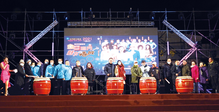 2021金門金喜臨門魅力犇放跨年晚會,鄉親不畏寒冷到場,愈夜愈HIGH,如同熱力四射的四分衛樂團一樣「跟他拚了吧!」。縣長楊鎮浯、議員張雲德、王秀玉以及五鄉鎮長出席和鄉親一起倒數迎新年並抽獎同樂,神秘嘉賓金曲歌王流氓阿德也返鄉共襄盛舉,壓軸登場的鐵肺歌后彭佳慧,獻唱數首膾炙人口的歌曲。全體人員在寒冷的夜晚、繽紛燦爛的花火中,送走2020迎接2021。 「金喜臨門魅力犇放」金門跨年晚會首度移師金沙鎮舉辦,今年因為防疫的關係,採高規格進出規範,除了必須全程佩戴口罩,並採實聯制登記,下午5時許即有熱情的民眾、學子陸續進場。文化局防疫工作確實,除了進場以酒精消毒手部,也依續測量體溫及貼上貼紙註記,並透過線上方式以及縣民卡及身分證掃描等實名制登記,而未攜帶證件者也經由志工手寫協助,民眾也相當配合,秩序相當良好。 晚會自晚間七時三十分起登場,由金門棠風舞蹈團擔任開場演出,縣長楊鎮浯、金門縣文化局長許正芳、金沙鎮長吳有家、議員張雲德、王秀玉,金沙鎮民代表會副主席黃聰成率全體代表、金湖鎮鎮長陳文顧、金湖鎮民代表會主席蔡乃靖、金城鎮鎮長李誠智等貴賓以及縣府一級主管一起擊鼓,正式敲響活動序曲。 縣長楊鎮浯表示,首次將跨年晚會移師金沙舉辦,然全台籠罩在疫情的氣氛下,並且配合防疫規定無法有攤商,實為美中不足,也向所有鄉親致歉。不過,現場天氣雖冷但民眾很熱情,也讓現場都熱了起來,且愈夜愈HIGH。 楊鎮浯也向鄉親細數縣府編列預算以及爭取中央支持之下,將在金沙啟動的各項建設,例如馬山多功能港、停車場、室內運動場、金沙戲院、金東戲院、公教訓練中心、親子公園、綜合社福大樓以及陽翟大街活化招商等,應是近年來全勝時期。 楊鎮浯並推崇金沙鎮「高粱老街風獅爺文化季」設計「尋找風獅爺APP」推動帶狀性觀光活動,從八月起觀光活動開始後到年底持續推展,加上縣府的「積不可獅」及周邊景點活動,讓金沙鎮下半年來人氣強強滾。縣府團隊會與各鄉鎮攜手合作,並且在金門縣議會的支持下全力推動,全力建設金沙,不會讓鄉親失望。 金沙鎮鎮長吳有家也表示,感謝縣府對各項鎮務的支持,尤其即將在金沙啟建許多重大建設,相信金沙未來將會不一樣。2020年因為疫情關係讓許多人的生活受到影響,非常難得此次跨年晚會到金沙舉辦,天氣雖然冷但是不減鄉親的熱情,期許我們將不好的事情都留在2020,一起迎向嶄新的2021。 昨日的跨年晚會,由無尊、黃沐妍主持,藝人林吟蔚、林雨涵、邵雨薇等接力開唱,並透過贈獎和鄉親互動。四分衛樂團演唱「跟他拚了吧!」、多麼美好的一天、起來等多首歌曲,也再次炒熱現場氣氛。台語實力派唱將曹雅雯以及陳雷也現身金門跨年晚會,並演唱「思念的歌」及新專輯癮頭、Cowbell,以及歡喜就好、自然就是美、隨緣、猴賽雷等歌曲。神秘嘉賓金曲歌王流氓阿德也返鄉共襄盛舉,獻唱無路用的咖小、虧欠、全世界最亮的光。壓軸登場的鐵肺歌后彭佳慧,也獻唱全世界最亮的光、快樂的人請舉手、相見恨晚、大齡女子、敲敲我的頭等知名歌曲,全場歌手攜手倒數並在8分鐘美麗燦爛的花火中迎接2021年,並互祝新年快樂!