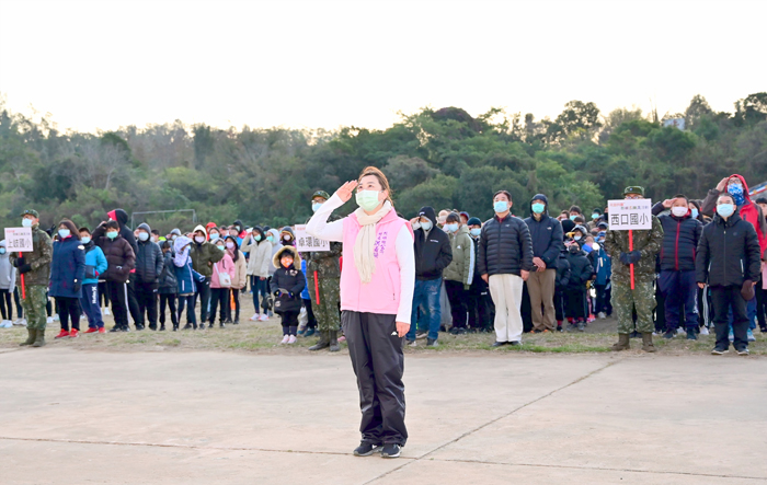 烈嶼鄉公所慶祝110年元旦升旗~烈嶼逗陣走活動,昨(一)日清晨六時三十分展開,烈嶼鄉長洪若珊和地方各界、軍民、學生一起參與升旗典禮,迎接嶄新的一年。升旗典禮後也舉辦健走活動,軍民一起走出健康,走出快樂。 民國110年烈嶼鄉元旦升旗典禮,昨日清晨6時30分假東林復合式運動場舉行,由鄉長洪若珊主持,鄉代會主席方駿洋、副主席吳福全、鄉代表陳秀治、林長征、金門縣體育會烈嶼分會、烈嶼鄉體育會、金門元功會烈嶼分會、烈嶼民俗舞蹈協會、返老還童養生氣功烈嶼練功場、烈嶼分駐所、烈嶼消防分隊、地區岸巡單位、烈嶼守備大隊官兵弟兄等單位團體暨鄉公所員工和學校校長、村長、社區發展協會理事長、民眾、學生等共襄盛舉,共同迎接2021年的第一道曙光。 鄉長洪若珊帶領著軍民、學生、鄉公所團隊高唱國歌,看著青天白日滿地紅國旗冉冉升起,大家互道新年快樂。 洪若珊指出,藉由活動讓大家齊聚在這裡,除激發軍民精誠團結及愛國情操,更推展全民運動風氣,促進國民身心健康,歡喜迎接新的一年開始的第一天,感謝鄉親的支持、各界的配合,因為有大家,才能讓家鄉越來越好;往後亦會帶領公所團隊持續努力,也請大家繼續支持及指教,一起為這塊土地來貢獻努力。 隨後展開健走活動,近千位軍民精神抖擻並洋溢著活力的運動健走,從東林複合式運動場起點出發→介壽公園→湖下勝利門(八二三紀念碑)→東林濱海公園(習山湖)→陽山→體育館(終點站),走完全程者除在陽山站領取紀念品外,到達終點還可參與摸彩活動,鄉公所準備12.5公斤洗衣機、高粱酒禮盒、禮券、陶瓷碗組禮盒等多項禮品讓民眾摸彩,讓烈嶼民眾喜迎新年。
