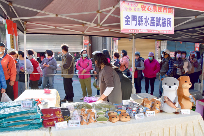 「安心農民市集」26、27日在總兵署前廣場開市,新鮮蔬菜、地方農特產吸引鄉親捧場。更有水試所優惠出售的白蝦、金目鱸魚,令鄉親甘願一早就大排長龍等候。 由縣府與縣農會共同主辦,主打讓消費者「吃在地、享當季」,網羅金門在地農漁畜牧產品的「安心農民市集」,結合地區農產品,以及水試所的白蝦、金目鱸魚及文創商品,再加上金沙鎮蔬菜產銷班第一班26日提供黑蒜頭小籠包、第二班今日提供高粱酸白菜水餃試吃,內容豐富多樣。品嚐過黑蒜頭小籠包的民眾表示,或許是加了黑蒜頭的原故,吃起來顯得更甜,是個不錯的味覺體驗。 安心農民市集26日上午9時開市,一早就湧進人潮,水試所攤位更是大排長龍,圍著攤位區繞了整整一大圈;會場的好商品也在民眾吃好逗相報下很快完售,11點不到,已剩沒幾攤在繼續招睞顧客。 縣府建設處表示,這項戶外市集的活動時間是26日至27日上午9時至下午2時。錯過水試所首日魚、蝦限量特賣的鄉親,今日千萬不要再錯過。