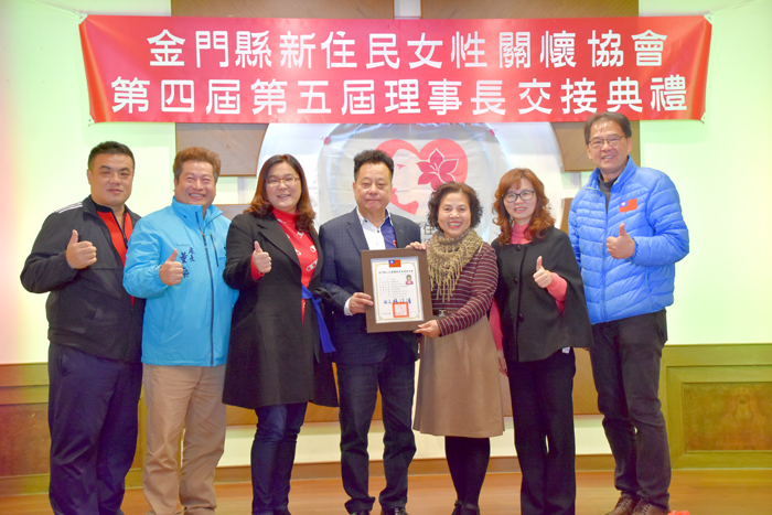 金門縣新住民女性關懷協會26日假海洋餐廳舉行第四屆第五屆理事長交接典禮,在縣議會議長洪允典等人的見證下,第四屆理事長王秀玉卸任,由許淑惠接任第五屆理事長,在眾人的祝福下,期許協會在新理事長的帶領下繼往開來、永續經營。 縣議會議長洪允典、立法委員陳玉珍、社會處處長董燊、縣長夫人張婭玲、國民黨金門縣黨部主委石兆瑉、金寧鄉鄉長楊忠俊、金城鎮鎮長李誠智、金沙鎮秘書許萬恭、縣議員王秀玉、金寧鄉代表辛愛華、金城鎮代表陳子芸、金沙鎮代表呂寶玉、金湖鎮代表陳向鑫等人出席新住民女性關懷協會理事長交接典禮。並由洪議長頒當選證書給新住民女性關懷協會第五屆理事長許淑惠。 王秀玉感謝姊妹們對其兩屆任內一路的支持與愛護,因為姐妹們對其相挺、信任,讓新住民女性關懷協會一路成長。她表示,協會成立初期常有人不清楚協會的服務內容,因此常得對外說明。相較於其他相類的協會,協會的營運常是成員出錢出力,於每年三節辦理關懷活動。金門是個多元的社會,有許多自外地嫁到金門來的姊妹,金門用同理心關懷、接受她們,她們即是金門未來的原住民。相信協會在新任理事長接任後,在其帶領下,協會能繼續發光發熱。 洪允典表示,到了金門就是一家人,新住民對地區貢獻很多,感謝到金門來的姊妹們。金門的土地不大,有緣共同在這裡生活確實不簡單,大家一起為金門這塊土地打拚。協會前會長王秀玉用心、勤快,新會長許淑惠熱心、耐勞,相信協會的發展將來會更好。 張婭玲致詞時說到,她本身是新住民的一分子,感謝協會幫助到金門的新住民姊妹們,對姊妹們的諸多協助與幫忙。她期望和新住民女性關懷協會一起為縣內的姊妹們服務。 石兆瑉指出,新住民女性關懷協會是國民黨一個非常重要的組織,在前理事長王秀玉的領導下,奠定一個非常好的基礎,期許新任理事長許淑惠勇於承擔,服務金門的新住民。 金門縣新住民女性關懷協會第五屆理監事名單如下:理事長許淑惠,常務理事薛辰汝、呂寶玉,理事楊意金、許淑卿、蔡琪秀、莊麗芬、楊赤玉、黃秀治,常務監事辛愛華、監事李迺瑾、張彩蓮,總幹事黃秀珍。協會並聘請李誠智、鄭易岳、邱嘉樹、許燕輝、李永金、陳子芸、許峻岷、陳大隆等人為顧問。