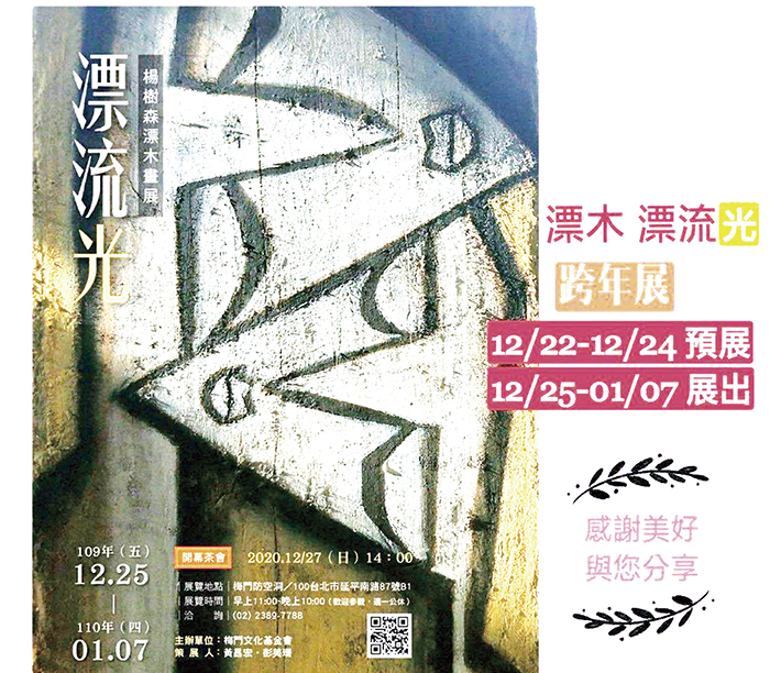 繼年初《漂》、《漂航》之後,《漂流光》楊樹森漂木畫展(見圖),由學者教授黃昌宏、彭美珊夫婦共同策展,選定跨年的2020年12月25日至2021年元月7日在梅門文化基金會的梅門防空洞開展(台北中山堂對面,台北市延平南路87號B1),昨(12/27)日星期天下午2點開幕茶會,同鄉、藝文各界,包括專程從金門飛來的立委陳玉珍,行政院金馬聯合服務中心簡任參議范燕燕及作家牧羊女(楊筑君)等百餘嘉賓雲集,擠爆「防空洞」,共同回味戰地「躲防空洞」的砲擊歲月,也一同迎接跨年美麗境界漂流光,許一個美好未來。 藝術療癒,尋求焦慮時代中的內在和平,楊樹森近來的畫展,不止同鄉,也吸引了藝文、企業及普羅大眾的目光,連忙碌的銀行家,匯豐台灣區總裁陳志堅也停駐過;又意外引來許多政治人物,擔任過行政院長的毛治國、文化部長洪孟啟、政務次長邱于芸,以及海基金會董事長張小月,親民黨主席宋楚瑜胞妹宋楚瓊等,都是展場安靜的賞畫者。 聖誕節開展日,行政院前院長毛治國夫人錢瑩瑩教授及中華科大校長郭承亮等人亦進入梅門防空洞欣賞楊樹森《漂流光》展場,對漂流木畫作驚豔不已。 〈楊樹森漂木畫展,賦予朽木亮麗色彩:目前正在梅門防空洞展出,最美的風景就是人的臉〉,創報10年的《168周報》藝術投資版,通常以國外藝術市場為主要報導,看好楊樹森畫作收藏價值,12月26日出報的第504期,罕見以台灣藝術家楊樹森《漂流光》展覽為頭條強力推薦。 加拿大英屬哥倫比亞大學比較文學博士孔書玉也以〈無用之用:楊樹森和他的漂木藝術〉一文向兩岸、海外發聲。 楊樹森,1958八二三砲戰期間出生於金門古區村10號,1977金門高中畢業旅台就讀中原大學機械系,軍旅後任職台北航空貨運站。 1980《747的迴響:楊樹森畫展》即在中原大學校園展出,此後歷數十次個展、聯展,也有多部紀錄片聚焦,光是2020年,從年初到年尾,包括《漂:楊樹森個展》(台北大澐YUN ART)、《漂航》短片拍攝(導演/陳心怡)、《漂航:楊樹森漂木畫作巡迴展》(蘇馬利體美學創意藝術公司)、新北三峽蘇馬利體藝廊/新北三峽初芯初蒔/新北三峽老柴咖啡、金門睿友文學館《漂流的文學樹:楊樹清文學作品展》楊樹森插畫展、台北華山文創園區紅館《島嶼之外》金馬詩畫展、行政院金馬聯合服務中心《島嶼之外》金馬詩畫展、台北梅門防空洞《漂流光》畫展,都可看到楊樹森豐沛又飽滿的創作能量。