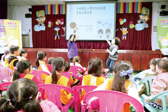 古城國小附設幼兒園日前辦理全園空氣品質宣導活動「認識霾害,大家一起來」,由該校幼中班呂文珠、黃庭潔二位老師帶領幼兒園全體師生透過有趣的PPT、影片和空氣品質拳PK賽,結合環保署空氣品質宣導旗幟、標語等,進行校園空氣品質宣導活動,一起攜手守護幼童身體健康,並為空氣品質把關。 該項宣導活動係於日前在古城國小活動中心舉辦。古城國小附設幼兒園全園師生全程參與這項寓教於樂的宣導活動,由該校幼兒園中班呂文珠和黃庭潔二位老師帶領幼兒園全體師生進行一場空氣品質宣導和有獎徵答。充滿逗趣又誇張的空氣影片,引發小朋友的尖叫聲與熱烈的討論,歡樂的空氣品質拳PK賽帶領小朋友認識空氣品質宣導旗幟,現場氣氛熱烈,深受師生喜愛。 在校園空氣品質宣導活動中,老師以小朋友最喜歡的影片「皮皮與小清之煙霧襲擊」、「小空的星期天」影片引起動機,淺顯的影片深受小朋友的喜愛。除此之外,老師帶領小朋友透過有趣的PPT認識空氣污染的來源,瞭解空氣污染對身體的危害並認識空氣品質五種顏色旗幟與口罩的戴法。幼兒園全體師生透過科技資源運用環保署的網站與APP查閱當日空氣品質與旗幟的顏色,來判斷當日空氣品質的好壞,讓全體師生共同對抗霾害。 古城國小校長楊成業表示,辦理空氣品質宣導活動,希望能協助師生瞭解校園及室內空氣品質維護管理政策、學校應遵守的相關法令規定,以強化校園師生於空氣品質不佳時期之自我防護意識及觀念,提供更安全無慮的學習場所。