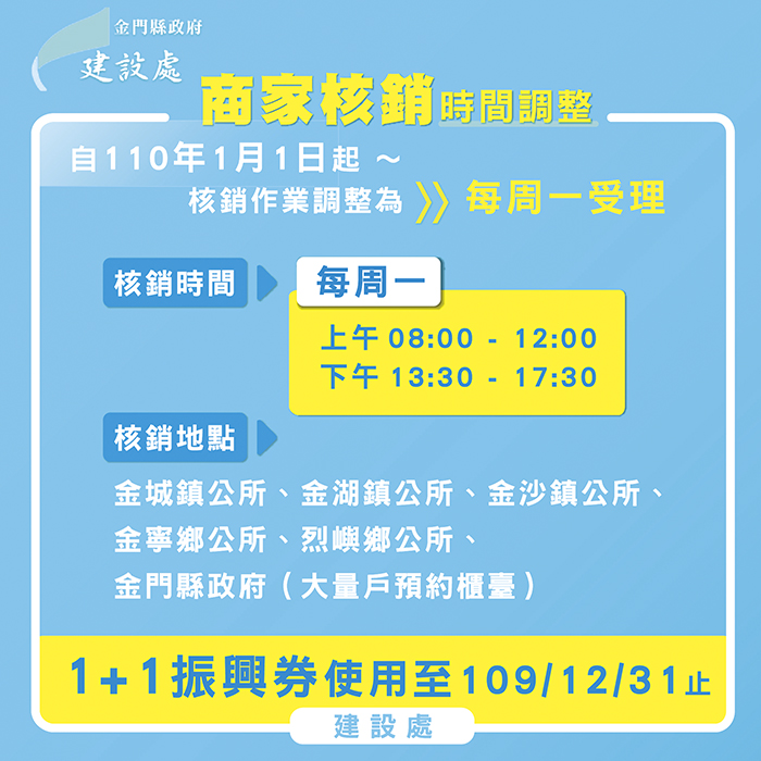 金門縣政府昨天表示,今年7月中旬開始流通的「金門1+1振興券」,截至109年12月14日已核銷新臺幣5億569萬8,500元整,發放回收率約九成六,僅餘新臺幣2,310萬4,500元仍在地區流通未申請核銷,再次提醒鄉親務必於109年12月31日前使用完畢。 縣府並表示,1+1振興券大部分已回收撥款,考量實際核銷數量及撙節相關作業人力、經費,自110年1月1日起核銷作業調整為每周一受理,業者可依需求於每周一備妥相關文件並攜帶已核發票章(收據章)之1+1振興券及發票章(收據章)至各鄉鎮公所核銷櫃臺申請,相關資訊如下: 一、核銷時間:「每周一」上午8:00-12:00及下午13:30-17:30。 二、核銷地點:金城鎮公所、金湖鎮公所、金沙鎮公所、金寧鄉公所、烈嶼鄉公所、金門縣政府(大量戶預約櫃臺)。 縣府建設處補充說明,金門1+1振興券使用期限至109年12月31日,業者核銷期限則至110年2月28止,110年農曆年節後,該處也將依核銷實際情況滾動式調整受理時間、地點,配合業者實需增加或減少服務時間地點;另針對核銷作業相關問題,業者也可電洽金門縣政府建設處工商科082-326204洽詢。