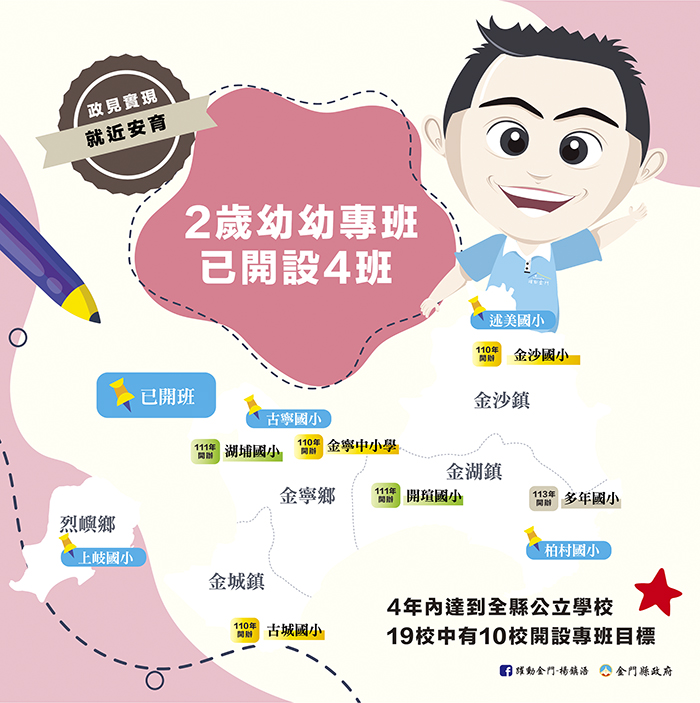 開設十校十班兩歲幼幼班 為了減輕年輕家長負擔,實現楊縣長「就近安育」的政見,教育處積極推動2歲幼幼班開辦事宜;這一年多來,陸續在上岐、古寧、述美和柏村等四個國小開設兩歲幼幼班;透過明亮的教室、嶄新的教具設備、還有具愛心及耐心的老師群等等的安排,讓孩子在溫馨的學習氛圍中,健康開心地成長,預計到113學年,總計會在十校開辦十班兩歲幼幼班。 公眾良性對話 優化教育政策 在國際交流學習活動方面,以往地區視學生寒暑假出國為必然,但並非出國即稱為國際教育,應該強化與學習課程之連結。隨著今年及明年國際交流計畫受新冠肺炎疫情影響無法出國,教育處順勢調整,著手籌備110年度「疫情不出國,學習多更多」配套方案;同時辦理國際教育在地化及沉浸式英語學習營隊,在寒暑假發展課程,且採使用者付費方式,地區家長支持,報名滿額。 另外也調整行之有年的學生乳品供應原則,從免費改為使用者付費,改善免費衍生的浪費等缺失,進而導正學生愛物惜物及養成良好生活習慣,爭取家長、學生及各界支持,最後達成共識的完善結果。 完善師保制度 回歸學校需求 每學年度保送公費生,是培育在地師資重要的來源,公費生的專長應與教學現場需求切合,才能讓學生在專業的師資教授下,培養扎實的基本學力。可惜的是,以往保送時未與學校需求對接,發生長期以來學校需求與公費生實際專長不符的窘況,109年甚至發生兩名國中自然老師回來卻沒有缺額的情況,此皆因保送時未審慎評估的結果。去年教育處盤整未來四年各校師資需求,對照在學公費生,一次完成未來五年公費生分發作業,38名公費生已經知道畢業要分發服務的學校,未來師保需求也改由學校提出,經教育處審核後薦送,以符教學現場需求。 學區共聘專業運動教練 整合資源拔尖培育 地區運動風氣極甚,楊鎮浯縣長希望針對具有發展潛力的體育人才,投入資源,拔尖培育。針對金門多為小校的特性,改變以往作法,採整合學區,聘用學區專任運動教練,以向下扎根培養。108年由各學區提出申請計畫,經審查委員會審查後,今年共聘任8位教練,包括桌球四位、羽球兩位、籃球一位、田徑一位,各學區選手參與訓練意願和人數明顯增加,有效提升運動競賽成績。 營造優質運動環境 倍增運動人口 金門縣體育業務在體育場、各級學校及體育會及所屬單項委員會協助推動下,蓬勃發展,各鄉鎮陸續提出建置體育場館等硬體設施需求,為避免場館重複建設投資,使公共建設效能互補最佳化,教育處108年起依各鄉鎮需求進行盤整,目前五鄉鎮新增中運動場館設施共計11案分別為: 一、金城鎮:(一)金門縣立體育館於109年3月2日啟用。(二)「金門棒球場整建工程」,預計110年底完工。 二、金湖鎮:(一)金東游泳池興建案,預計110年2月完成先期規劃。(二)正義國小半戶外球場興建案已完工。 三、金沙鎮:(一)忠孝新村籃球場整修工程案,已啟用。(二)「前瞻計畫金沙國小地下停車場│金東全民運動館新建計畫」,預計於114年完工。(三)安瀾國小半戶外球場興建,預計於110年年中完成。 四、金寧鄉:(一)金寧鄉帶狀運動休閒園區,預計109年12月31日完成先期規劃。(二)古寧國小半戶外球場興建案已完工。 五、烈嶼鄉:(一)烈嶼鄉青少年棒、壘球場,拓增訓練場地,預計113年完成。(二)烈嶼國中400公尺標準運動場預計109年12月27日完工。 前開十一案,功能彼此不同,互補共進,未來朝向「使用者付費」及「與學校共用共管」的原則下經營場館,以增加場館使用率並提升場館營運品質,軟硬兼施,營造優質運動環境,以達倍增金門縣運動人口之目的。 教育是百年樹人的事業,透過制度的建立與回歸學習本質,首重培養學生的基本學力,就是讓孩子打好根基,在擁有基本能力後,才能掌握多元學習的機會,擺脫離島學習資源的限制,勇敢面對未來跨域競爭發展的挑戰。教育工程本該穩扎穩打,縣府團隊不譁眾取寵,不取巧走捷徑,全力厚植孩子的實力之外,也堅信培養孩子就是培養金門的未來,優質的人力才是金門此後得以開展、得以發光發熱的重要基礎。