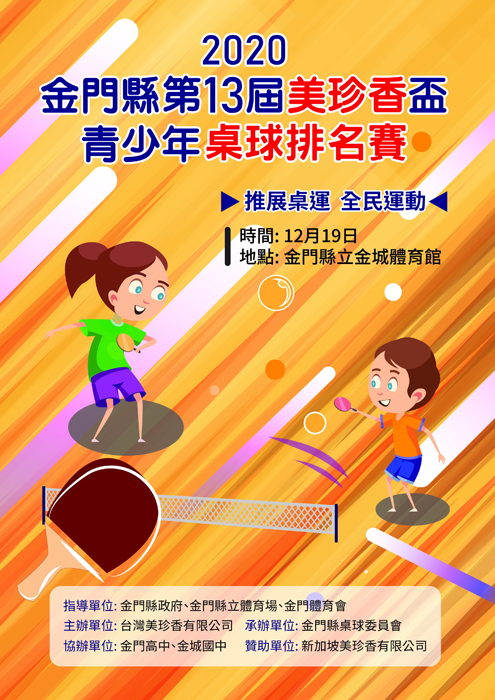 為推展本縣桌球運動,增進國民身心健康,並提昇基層桌球技術水平,由本縣俊彥楊碧泉先生所屬的台灣美珍香有限公司出資辦理的「2020年金門縣第13屆美珍香盃青少年桌球排名邀請賽」訂於本(12)月19日於金門縣立體育館舉行,因應防疫本屆比賽是採邀請賽性質舉行,比賽均為個人賽,屆時歡迎地區民眾到場觀賞比賽為選手加油。 台灣美珍香有限公司表示,去年因縣立體育館進行整修,其他場館經實地勘查後又不足以支應比賽規模,幾經考量後決定停辦一年。而今年又逢新冠肺炎疫情影響,本項比賽規劃初期並未抱太多的期待,欣慰的是金門地區目前為零確診,故比賽如期辦理。 和往年比賽不同的是,今年因應防疫採邀請賽性質舉行,只邀請本縣各級學校菁英好手參賽,並未邀請台灣及大陸地區好手參賽,但為了增加精彩度,比賽方式不同以往,除了磨練球技外,並充份給予選手機會,各組別均採2次淘汰制。另外高中組別亦同時邀請中小學各組頂尖選手跨組參賽,增加比賽可看性。 本次比賽均為個人賽,計有:高中男生組、高中女生組、國中男生組、國中女生組、國小高年級男生組、國小高年級女生組、國小中年級男生組、國小中年級女生組等8組,每組均取4名頒發獎盃及獎金,歡迎民眾到場觀賞並幫選手加油。