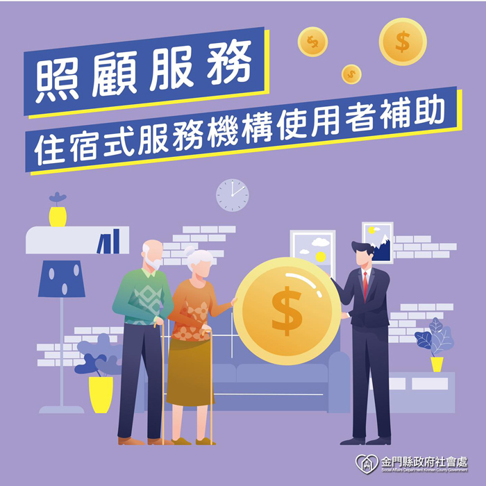 一○九年度「住宿式服務機構使用者補助方案」(見圖)申請限使用機構者本人(優先)或機構簽約人提出申請,第一階段自今年十月一日至十二月三十一日止(自一○九年一月一日起至申請日前一日,實際入住機構天數累計達九十天以上者,累計期滿後始可提出申請);第二階段自一一○年一月一日起至三月二日止。另申請今年度補助,若未及於一一○年三月二日前提出申請,逾期不予受理。 今年度「住宿式服務機構使用者補助方案補助條件(應同時符合): 一、入住之機構類型:使用機構者入住依法設立各類住宿式服務機構,包含一般護理之家、精神護理之家、老人福利機構(除安養床外)、身心障礙機構、國軍退除役官兵輔導委員會所屬榮譽國民之家(自費失能養護床、自費失智養護床)、兒童及少年安置及教養機構(依兒童及少年福利與權益保障法委託安置且領有身心障礙手冊、證明者)及提供住宿式服務之長期照顧服務機構。二、入住天數:自今年一月一日起至十二月三十一日止,實際入住機構天數累計達九十天以上。以下情況不列計入住天數:1、保留床位期間。2、機構喘息服務(領有長期照顧給付及支付補助)期間。3、出入機構算進不算出,不重複列計。 使用機構者納稅狀況,經稅捐稽徵機關核定使用機構者之同一申報戶107年度綜合所得稅申報資料為以下皆符合者:1、累進稅率未達20%者。2、股利及盈餘合計金額併入綜合所得總額合併計稅者。3、未課徵基本稅額者。其符合補助條件者,依稅捐稽徵機關核定107年度之5稅率級距,採階梯式補助,每人最高新臺幣六萬元。採一次性發給。另,今年度住宿式服務機構使用者補助方案申請受理申請機關為申請人逕向109年度最近一次入住機構所在地之直轄市、縣(市)政府,如在金門縣,請洽金門縣政府社會處,提出申請。金門縣政府社會處聯絡窗口:金門縣老人機構請洽蔡先生082-318823轉67549。金門縣身障機構請洽蔡先生082-318823轉67507。想了解更多詳細資訊請洽衛福部長照專區網址。
