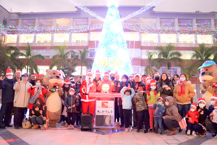 國立金門大學於綜合大樓星形廣場裝置大型的聖誕樹與燈飾,昨日進行燈飾啟動儀式。金大校長陳建民和校內師生、外籍學生和社區大、小朋友一同點亮聖誕樹,迎接聖誕節到來。 社區小朋友和金大吉祥玩偶大金、小金開心參與點燈儀式。許多人扮演聖誕老公公和麋鹿,在高約10公尺的聖誕樹前開心唱歌、表演和分享糖果禮物,全校瀰漫在濃濃的聖誕氣氛之中。 金大校長陳建民表示,聖誕節是一個家人團聚的喜慶節日,許多家庭通常會裝飾聖誕樹,聖誕樹象徵生命長存,點燈則代表迎接光明的到來,也代表校園中將充滿愛、溫暖與希望。他說,金大是個大家庭,在社會各界的支持和肯定中成長、茁壯,感謝歷任校長和全體教職員的共同努力,讓來自台灣、中國大陸、港澳、馬來西亞、越南、印尼和阿根廷、巴布亞紐幾內亞、韓國、迦納等地的僑生,雖在新冠肺炎疫情期間,仍能安心課業學習,並持續推動校務發展。 金大表示,今年聖誕樹的高度為10公尺,是金門地區最高的燈飾聖誕樹,並在周邊裝飾多彩動感的燈廊、燈瀑和播放聖誕音樂,將展示到明年2月,歡迎金門鄉親和蒞金遊客到金大體驗聖誕氣氛,並打卡留念。此外,將於12月26日舉行Merry Kin's Mas聖誕晚會,歡迎大家前來共度歡樂佳節時光。