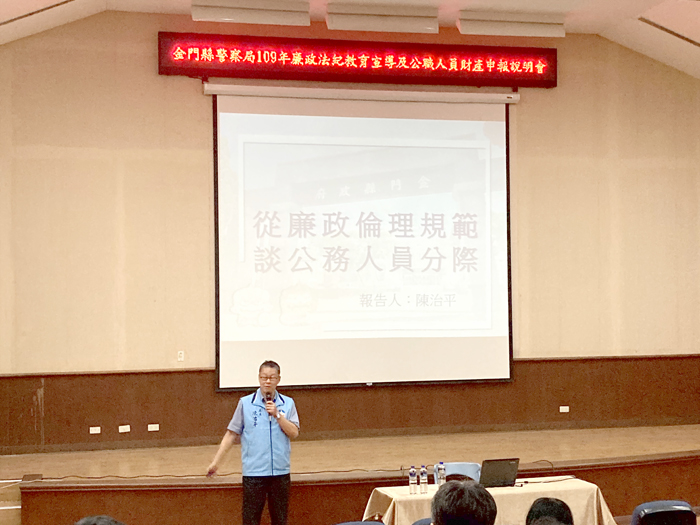 為建立新進公務人員廉能觀念與法治素養,並使財產申報義務人熟悉財產申報規範及作業流程,金門縣警察局辦理「109年度廉政法紀宣導暨財產申報作業講習」,局長蔡祥春表示,希望藉由本次廉政法紀宣導講習,使相關人員熟悉陽光法案,避免因不諳法令而誤觸法網,並增進警察局同仁對廉政倫理規範及公職人員利益衝突迴避法認知,使執法透明,服務便民,提升效率。 本次廉政法紀宣導暨財產申報作業講習課程內容以陽光法案為主軸,特邀請金門縣政府政風處長陳治平、科長吳俊揚及蔡炳火擔任講座,課程內容包括「從廉政倫理規範談公務人員分際」、「公職人員利益衝突迴避法重點研析」及「公職人員財產申報作業流程暨錯誤態樣」。課程結束後由警察局政風室與新進同仁舉行廉政座談會,希望藉由本次講習,使警察局同仁更能熟稔基本法規、財產申報系統操作、常見錯誤態樣,避免因不諳公職人員財產申報法、廉政倫理規範及公職人員利益衝突迴避法等相關法令而誤觸法網遭受處罰。 蔡祥春局長表示,貪腐會侵蝕社會的良善價值,對廉潔、誠信與信任造成破壞,為貫徹楊鎮浯縣長廉能政府的施政理念,致力確保警察同仁秉持誠信和廉能的價值觀,共同為金門鄉親維護治安及交通,警察局將透過多種社會參與管道進行反貪宣導,希望將廉潔誠信內化成為廣大民眾所重視之價值,型塑金門縣警察局對貪污零容忍的公正廉能形象。