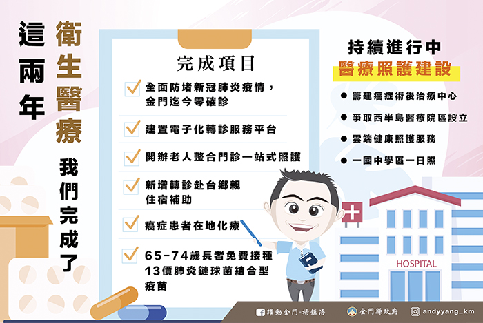 在地醫療升級 當地治療免奔波 家裡若有親人罹患重大疾病、緊急傷病,需要到台灣就醫,對於病人和陪看病的家屬,不管在心理、生理乃至經濟層面,都是極大的負擔。這兩年縣府致力於「在地醫療升級」,讓鄉親在當地就能受到優質的醫療照顧,免於台金兩地奔波。 癌症化療在地化 減少臺金奔波 縣政府透過補助衛福部金門醫院成立「癌症化學治療調劑室」,癌症化療在地化獲致重大進展,於108年7月16日啟用,提供包括肺癌、頭頸癌、胃癌與食道癌等患者在地化療,未來會將大腸癌、肝癌、膽管癌與胰臟癌納入治療範圍。迄109年9月底止,已有93人次在地接受治療,普獲好評。 白內障在地手術也OK 此外,縣府補助金門醫院購置「白內障晶體乳化儀」及「玻璃體暨視網膜手術設備」,罹病民眾可及時在地醫療處置。其中白內障晶體乳化儀每年可提供三百餘例白內障在地手術,估每月提供25人進行手術,自107年底啟用迄109年9月底止,計有541人次受惠。而玻璃體暨視網膜手術設備,自108年12月底迄109年9月底止共進行16台手術。 65-74歲長者縣府補助免費接種13價肺炎鏈球菌結合型疫苗 肺炎,號稱是威脅老人家健康的頭號殺手,也是本縣108年十大疾病死因排名第三。為了顧好我們長輩的健康,自今年9月中旬起,65-74歲金門籍的長者,由縣府補助免費接種13價肺炎鏈球菌結合型疫苗。透過完整的疫苗防護,將大大降低長者感染肺炎鏈球菌引發的併發症及死亡威脅。 就近日照安老 人本照護關懷 創新社區日照中心 減輕照顧者負擔 在長者樂活和健康守護方面,縣府創新作法,結合在地團體,協助本縣金城鎮珠山社區發展協會附設私立珠山社區長照機構,共同提供以人為中心、以社區為基礎的生活照顧服務。於109年3月開辦,提供日間照顧服務,每日最多服務30人,全年服務人次預計達2,500人次,可增進長者社會參與,並減輕家庭照顧者身心負擔。 一國中學區一日照 預計明年4月達標 一國中學區一日照是楊縣長重要政策目標,提供民眾可近、多元的照顧服務以落實在地安老理念。金城的珠山日照中心及烈嶼的西方日照中心已經運作服務,獲得鄉親好評。而金湖衛生所、金沙衛生所的日照中心也已竣工,等相關驗收及認證程序完成後,即可加入服務鄉親的行列。金寧的日照中心,則是提列前瞻基礎建設計畫,於金寧鄉安美村安岐社區新建「安岐多元照顧中心」(小規模多機能),占地2,771平方公尺,總樓地板面積1,036平方公尺,109年2月動工,預計工程順利的話,將於110年4月開辦,提供金寧鄉日間照顧及夜間喘息服務;屆時,一國中學區一日照的目標即可達標。 目前也在推動建置「雲端健康照護服務」平台,提升縣民自我健康管理,預防慢性病併發症,於縣內關懷中心、服務據點、照管分站設置血壓、血糖健康量測站,可將量測後的數值透過資訊傳輸上傳至雲端管理平台,提供縣民自主健康管理與監測照護。 健全醫療建設 提升整體量能 籌建癌症術後治療中心 為提升本縣整體醫療服務量能,籌建「癌症術後治療中心」是楊縣長對在地醫療更長遠的規畫。去(108)年蔡英文總統蒞金出席823砲戰61週年追悼典禮,楊縣長向總統提出此議題後,金門醫院便與縣府商討確認朝向在該院舊門診大樓活化運用。另楊縣長於109年8月7日率隊拜會衛生福利部部長陳時中爭取,雙方達成共識,將邀請專家評估購置合適且合用設備後,再由衛生福利部醫療發展基金一次性投資籌建經費。目前已由行政院張景森政務委員主持專案列管,並依期程推進中。 爭取西半島醫療院區設立 為均衡東西半島醫療資源,縣府目標在西半島規劃建構融合健康促進、醫療服務及長期照護等多機能的醫療衛生專區,守護鄉親健康。未來如有業者具投資意願,可進一步朝維持基本營運、政府資源投入及多角化經營(如生殖醫學、小型醫美等)三大面向,推動本縣設立小規模綜合型醫院的可行性。 楊鎮浯縣長表示,他上任後,在衛生局、衛福部金門醫院及地區各醫療診所齊心努力下,金門許多醫療措施及改善作為上,我們已經有了一些具體的成績;之後縣府還會繼續進行本縣流行病學調查分析、推動醫療人力交流、提升駐金醫療人員數、優化長照照護等各醫療衛生議題。此外楊縣長也說明,金門整體醫療量能的優化及鄉親對於醫療信心的建立,是一項需要長期投入人力、物力及心力的大工程,他很願意與同仁、金門醫院及地區的所有醫護人員一同來努力,也希望鄉親能多多給予第一線的醫護人員支持與鼓勵,共同帶動金門進步的正向循環力量。