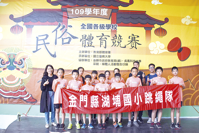 金寧鄉湖埔國小跳繩隊赴台參加教育部體育署109年度全國各級學校民俗體育競賽│跳繩觀摩表演競賽活動,以精湛的才藝,再傳佳績,奪得七個特優、七個優等、一甲等等獎項,成績耀眼,獲悉選手們獲獎,全校師生、家長一同分享努力爭來的榮譽。校長蔡玉羨很高興子弟們很爭氣,載譽榮歸,不負期望。 堪稱全國比賽規模最大、參賽人數最多的教育部全國各級學校民俗體育競賽,於十二月五日及六日兩天在台南大學進行各項賽事,湖埔國小跳繩隊由校長蔡玉羨、蔡鴻祺組長帶隊赴台參加跳繩賽,現場有來自全台三百多所學校超過四千名選手同台競技,手腳功夫千變萬化,呈現獨特的民俗美學,吸引大批人潮駐足觀賞,各家好手竭盡所能,展現最完美的技術,讓人目不轉睛,驚嘆連連。 湖埔國小自101年開始發展民俗體育特色│跳繩,每年均赴台參與全國各級學校民俗體育-跳繩競賽的盛會,成果一年比一年更豐碩,在此次競賽中,湖埔國小共奪得七個特優、七個優等、一甲等共十五個獎項,分別是跳繩個人男子花式特優何晟煒,個人女子花式優等楊采璇,雙人女子花式優等楊采寰、王永潔。開叉一迴旋特優錢松緯、開叉一迴旋特優何晟煒、開叉一迴旋特優楊采璇、開叉一迴旋特優魏釆蕎、二迴旋特優王永潔、二迴旋優等蔡鈞岳、二迴旋優等周岳、跑步跳特優王永潔、跑步跳優等楊采寰、跑步跳優等蔡鈞岳、跑步跳優等何晟煒。男子團體競速甲等:楊勝珽、楊承潾、邱建銘、郭聲清、錢松緯、周岳、蔡鈞岳、何晟煒。 蔡玉羨表示,跳繩隊與來自全國各級學校的選手相互切磋民俗技藝,展現平日紮實的技藝基礎,以巧手舞出各種變化招式,獲評審肯定奪得特優獎等多項獎項的好成績。而同學也透由觀摩活動,和各地選手做交流,汲取才藝,有滿滿的收穫。