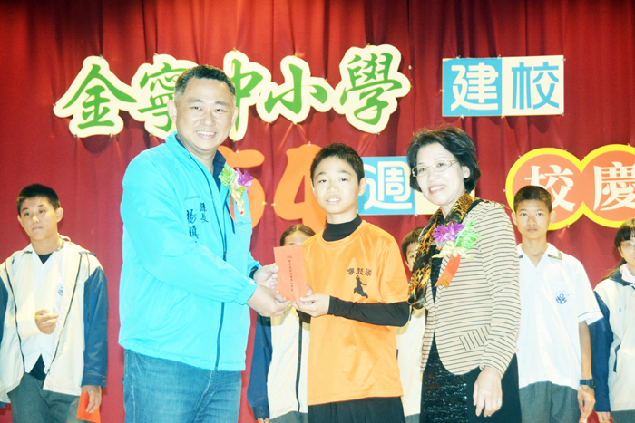 金寧中小學昨日舉行創校54週年校慶,縣長楊鎮浯和地方各界共同祝賀學校生日快樂。楊縣長指出,縣府持續推動公共托育之政策,從108年開始陸續在多所國小開設兩歲幼幼班,明年也會在寧中小附設幼兒園,增設兩歲幼幼班,減輕家庭的幼教支出,提供學區內更完善的幼兒托育照顧環境。 寧中小考量防疫期間,今年以簡單隆重的慶祝大會和趣味競賽的方式來歡慶創校54週年校慶。縣長楊鎮浯、金馬聯合行政中心執行長翁明志、金寧鄉代會主席莊振源、鄉代表辛愛華、李琳瑯、鍾尚志、退休校長楊瑞松、金鼎國小校長曾秀玲、古寧國小校長黃芸芸、湖埔國小校長蔡玉羨、寧中小國中部家長會會長陳金福、國小部家長會會長許三進、盤山村長翁品洋以及家長前來表達祝賀。 縣長楊鎮浯十分肯定陳雅蘭校長用心經營校園,帶領教師團隊認真投入教學工作,改善校園環境,提升教學設備,學生在學藝、環境教育、以及各項競賽,表現都十分優異。 楊縣長強調,縣府要照顧老的,也要照顧小的,縣府積極推動公共托育之政策,從去(一○八)年已經先行在烈嶼鄉上岐國小開設幼幼班;今年又陸續在金寧鄉古寧國小、金湖鎮柏村國小以及金沙鎮述美國小等校開設幼幼班,明年(一一○學年度)會繼續在金寧中小學、古城國小、金沙國小附設幼兒園增辦兩歲幼幼班,三年內在金門各國小開辦十班的幼幼班,提高幼教公共化程度,健全更完善的幼兒托育照顧系統,減輕年輕家庭的幼教支出,而能投入在職場工作。 楊縣長也表示,縣府會持續投注在教育工作,讓學子能在更優質的教育環境中學習,健康成長。楊縣長也祝福金寧中小學在過去54年,準備充足,未來的日子要邁向卓越。 校長陳雅蘭感謝楊縣長以及地方各界、校友會、家長會大力支持校務,讓寧中小深耕教育、創新發展學校特色,無論在課程開發、師生的教與學,都能配合時代的趨勢,邁向創新的教育。陳雅蘭說,學校積極運用在地特色開發環境教材,將環境教育融入各領域教學活動中,曾獲全國國家環境教育獎、台美生態學校銀牌認證、今年更榮獲全國推動能源教育標竿學校銀獎。 陳雅蘭並分享學校推動六年的民俗體育項目—太鼓、扯鈴、跳繩,在今年全國賽成績更大放異彩,榮獲全國民俗體育鼓藝文陣比賽全國優等。亞洲機器人運動競技大賽(北部賽區)第一名,取得北區代表權。學校擔任跨領域美感教育卓越領航計畫種子學校,並榮獲108學年度計畫團隊揚帆獎。109年度金門縣國中小學生資訊科技競賽-Scratch程式設計比賽,學生參與均一平台星空探險隊活動積分排名優異。109年金門地區語文競賽、第14屆聯合盃作文比賽金門地區初賽,也有優異成績表現。此外,學生在運動競技方面,更是有亮眼的成績,國小樂樂棒球賽奪得六年級組冠軍。109學年度中小學羽球賽,國男團體冠軍。2020秋季周末盃籃球賽,國男組冠軍。109學年度中小學桌球賽,國男團體亞軍。金門縣第22屆運動會,國男錦標賽冠軍、國女錦標賽亞軍。 陳雅蘭說,冠軍已不再是大校的專利品,小校也未必競爭力不足。也因有各界和校友、家長的支持和參與,才會有今日寧中小豐碩的成果。 楊縣長應邀頒獎校友會獎學金予十四名得獎學生,他們是:魏子淵、何昕芳、翁勝宏、蔡鎧任、翁翊恩、錢宇昊、翁子彧、王靖傑、董哲誠、許慈育、林琪修、蔡承祐、王婕語、楊琬琳。新敬業機車行獎助學金,由老闆楊肅謙親自頒發予得獎學生:李雅婷、莊善鈞、蔡昆僑、翁偉勍、蕭亦軒、唐嘉琝、鄭席宗、王奕程、莊學超、李蓁蓁。聖祖實業股份有限公司獎助學金,由副總經理葉杭代表頒獎予得獎學生李佳琪、李琬婷、鄭筠姍、古晏姍、翁瑀婕、翁杏榆、楊喬昕、翁榮澤、莊佳桐、周瑋竣、李正宇、呂宥葳、何宜蓁、莊秋生、翁勝閎。 活動中,學校也安排管樂演奏、太鼓演出,以及國小部學生和幼兒園幼生的表演,展現學生們多元的才藝。壓軸的趣味競賽移師到運動場進行,師生盡情參與競賽,運動出活力和快樂。