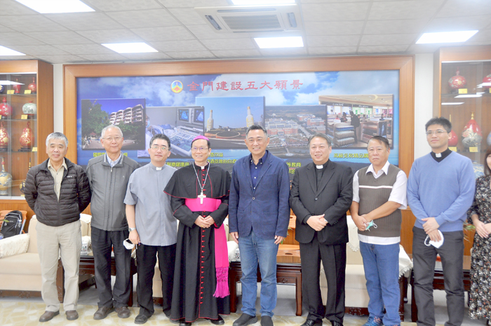 天主教台北總教區總主教兼金門馬祖外島署理主教鍾安住,昨日上午前往金門縣政府拜會,受到縣長楊鎮浯歡迎。楊縣長表示,金門包容多元事務,宗教更是鄉親安定力量,金門小島需要大家幫忙,歡迎天主教教友一起來參與金門社福服務。 鍾安住昨日上午十一時,偕同財團法人天主教會台北教區秘書長羅際元神父、財團法人光仁社會福利基金會執行長黃斯勝神父、金門金城天主堂本堂神父周戎、金城天主堂傳協會會長殷宇聲、前會長董彬森、許永面等,於拜會縣長楊鎮浯時,民政處副處長許一傑、科長蔡建鑄也在場作陪。 鍾安住表示,這趟來金門是為關心和尋找對弱勢服務,並和地方首長交流。十日下午並前往羅保田神父紀念園區走訪,對於他在辛苦歲月,貢獻畢生心力於金門的精神,值得所有教友來學習。而天主教台北總教區也計畫在金門規劃靈修中心,來提升大家心靈。並在金城天主堂成立兒童關懷站,以及三位修女住在金門,來照顧有需要的弱勢家庭子女和英語學習。 在與縣長楊鎮浯會談時,鍾安住希望能與縣府討論交流合作機會,更多服務本地教友和民眾,特別是滿足弱勢和年長居民的需求。並表達更多參與金門社會福利事務意願。 縣長楊鎮浯表示,金門歷經戰爭苦難,宗教發揮撫慰人心和安定社會的作用,歡迎所有宗教到金門,也相信總主教的到訪可以鼓勵教友,讓教友倍感振奮。楊鎮浯說,金門早年生活艱苦、加上戰爭,民眾經歷所有轉換階段,就學、就醫、交通限制多於台灣本島,比本島民眾經歷更多,比台灣其他地區民眾更需要「轉型正義」,更需要安定力量,天主教等宗教扮演了重要角色。楊鎮浯說,社會力量向來走在政府前面,社會正向力量推動著縣政向前走,尤其很多天主教教友都是金門社會主幹,感謝天主教界人士參與更多社會福利工作,讓民眾心靈平靜·社會安定。