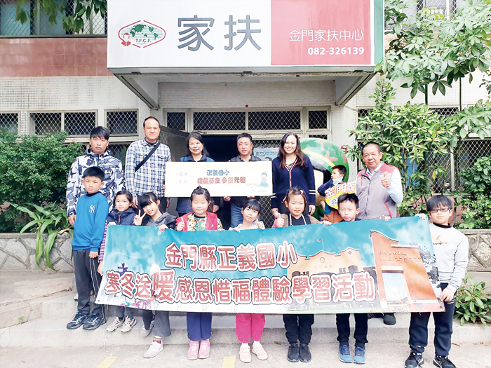 兒童幫助兒童,正義國小助家扶中心建館! 金門縣立正義國小寒冬送暖感恩惜福體驗學習活動,由校長許瑞芬率領四年一班的師生,並由家長會長李佳發與教務主任鄭美良陪同,一同前往金門家扶中心,捐助兒童扶幼館建館經費。 師生一行人將學校舉辦的跳蚤市場親子園遊會義賣所得,代表正義國小全數捐給家扶中心,做為兒童扶幼館建館專款,希望讓家扶中心的扶幼館可以早日完成,造福地方弱勢的同學。此筆兒童親自送來的捐款,由家扶中心扶幼主委李根遠代表家扶中心接受,並向小朋友及帶隊師長獻上熱誠的感謝和祝福。 正義國小許瑞芬校長表示,學校於12月3日舉辦跳蚤市場親子園遊會,透過二手物資的交換義賣,當日共籌得一萬六千元的金額,家長會長李佳發個人另外捐出一萬元,她自己則加上四千元,剛好湊足三萬元整,由四年一班的同學代表正義國小,把這一份由學校集合來的愛心善款,交給家扶中心用在兒童扶幼館建館使用上。也希望透過這個寒冬送暖感恩惜福體驗學習活動,建立兒童從小就培養其行善惜福的義舉和善念。 家扶中心扶幼主委李根遠指出,在中心建館籌措困難時,感謝正義國小師生的協助,讓家扶中心兒童扶幼館有更進一步的進度,離完工目標又更進一步。尤其是小朋友的捐款,更是感受到兒童純真的心意,特別感受到無比的喜悅。 家扶中心主任李桂平表示,再一次感謝正義國小同學們的愛心,以及家長會李會長與許校長的善心協助,將學校生活教育的學習和慈善活動結合,灌輸我們的下一代,從個人愛心行動出發,達到兼善天下的金門傳統社會道德的發揮。