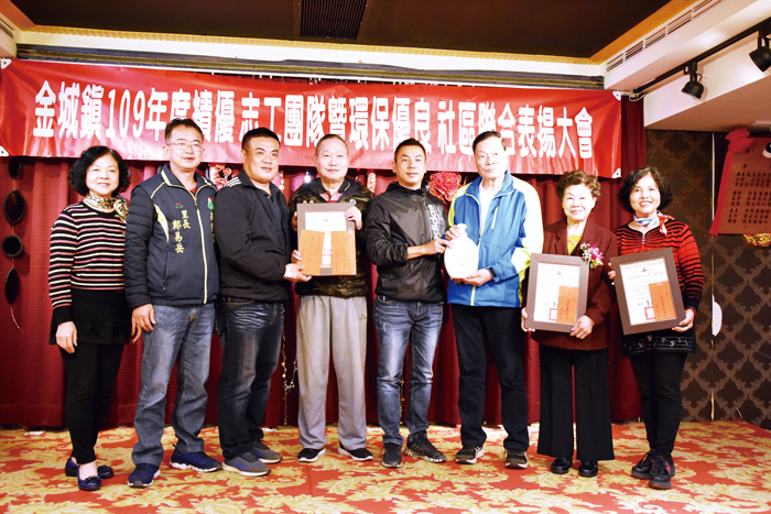 金城鎮4日假葡京餐廳舉行109年度績優志工團隊暨環保優良社區表揚大會,對鎮內績優志工團隊、優秀志工,及社區協助環境清潔維護、銀膠菊移除工作等項目予以表揚。 鎮長李誠智、鎮代會主席陳天成、代表郭永隆、各里里長、各社區理事長與理監事及總幹事等人出席見證志工及社區努力的成果。 李誠智感謝志工無私的付出,使得地方上的活動得以順利執行,讓社區的環境清潔維護與移除銀膠菊工作能有亮眼的成果。陳天成也感謝志工犧牲奉獻服務的精神,社會因此變得更和諧美好。 金城鎮頒發績優志工團隊獎金與紀念酒,贈予優秀志工禮券,給予環境清潔維護及銀膠菊移除工作表現優秀的社區獎狀,期勉各社區群策群力,為社區的美好共同努力。 金城鎮109年度績優志工團隊暨環保優良社區獲獎社區及個人如下: 績優志工團隊:南門社區、庵前社區、吳厝社區 優秀志工:許淑珍(南門社區)、李丕中(前水頭社區)、楊明珠(北門社區)、王瑞霞(民生社區)、吳成坤(向陽吉第社區)、徐國廉(賢聚社區)、陳永棋(庵前社區)、李筱薇(吳厝社區)、傅麗樺(金門城社區)、林馬贊(金城綜合志工隊)。 環境清潔維護: 特優獎:後豐港社區。 優等獎:泗湖社區。 甲等獎:東門社區。 乙等獎:南門社區、前水頭社區、和平新村社區。 入圍獎:西門社區、北門社區、鳳翔新莊社區、民生社區、向陽吉第社區、賢聚社區、庵前社區、夏墅社區、吳厝社區、燕南山社區、官裡社區、小西門社區、東沙社區、歐厝社區、古崗社區、金門城社區、珠山社區、富康一村金城新莊社區。 銀膠菊移除工作:第一名後豐港社區、第二名南門社區、第三名東門社區、東沙社區;績優:泗湖社區、和平新村社區、向陽吉第社區、庵前社區、燕南山社區、官裡社區、小西門社區;鼓勵參與:古崗社區。