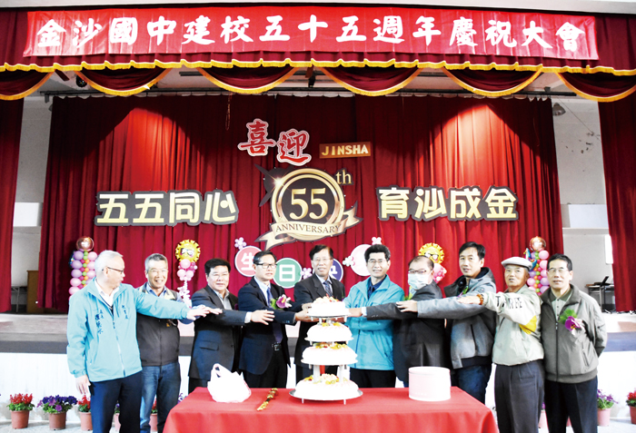 金沙國中昨日舉辦建校五十五週年校慶,學子進行班際跳繩比賽,透過「藝想不到」才藝展,並以管樂、古箏、熱舞、獨唱等表演為慶祝大會揭開熱鬧序幕,沙中學子允文允武也讓現場貴賓深表肯定。副縣長黃怡凱、立委陳玉珍等貴賓依序頒獎表揚傑出校友以及資深員工及志工,全體並齊唱生日快樂歌,祝賀沙中校運昌隆。 金沙國中建校五十五週年校慶,昨日上午假沙中體育館舉行,除了校慶表揚典禮外,金沙國中各處室也規劃校慶周活動,包括教務處「藝想不到」才藝展,學務處班際大合跳比賽,以及樂聲悠揚等,讓學子一展長才。而校慶周期間,輔導室也將這學期電機電子技藝教育課程結合校慶活動推出有獎填答活動,讓技藝班學生的成果展示,促進學生對技藝課程之認識。 而昨日在五十五週年校慶表揚大會前,全校各班齊聚令司台前,進行班級大合跳(團體跳繩比賽),考驗學子的默契、體力和團隊精神,最後由801班拔得頭籌,第二名903,第三名702,第四名703,第五名704,並於校慶典禮中公開頒獎表揚。 金沙國中自建校30週年起,每逢五必擴大辦理慶祝活動,昨日也不例外,欣逢五十五週年校慶,經歷屆校友推薦評選出25位傑出校友,由副縣長黃怡凱、立委陳玉珍、金馬聯合服務中心執行長翁明志、議會秘書長陳建興、金沙鎮鎮長吳有家、教育處處長羅德水等頒獎表揚,期藉由學長姊的優秀表現,能鼓勵在校生見賢思齊,未來亦能闖出屬於自己的一片天。 金沙國中校長黃明森表示,金沙國中經歷任校長及教職員以及校友對教育的關心及付出,歷經五十餘年的努力下,無論語文、數理、藝術、運動及品德教育都是學校引以為傲的特色。感謝五十五年來大家為沙中努力而有今日的環境和成果,期許續與在校師長攜手同心,帶領學子適性發展,育沙成金! 副縣長黃怡凱、金馬聯合服務中心執行長翁明志、議會秘書長陳建興、金沙鎮鎮長吳有家、校友會理事長李金贊、家長會會長王國泰等也紛紛獻上祝福並話勉學子。而典禮中,除了在校學子一展長才外,來自新店區米亞舞蹈團也帶來精彩的舞蹈秀,博得滿堂彩也為典禮再掀一波高潮。最後,與會貴賓一同切蛋糕,現場在生日快樂歌,以及校歌歌聲中,為沙中五十五歲生日慶典,劃下圓滿句點。 金沙國中五十五週年校際傑出校友表揚名單如后: 黃龍泉、張自福、蔡清其、陳佳結、黃邦印、鄭傑民、楊傳治、張雲權、尤明灝、黃素燕、葉維敬、黃奕焮、柯景順、王清追、黃義瀚、吳則雄、張金水、常春媚、王文琢、李賢發、王任瓚、王國泰、李境展、楊赤玉、王鈺筑。資深員工紀念獎:張振祥。愛心志工獎:吳家茜、呂靖綺。教育部一○九年度飲食教育影片及漫畫創作競賽徵選,國中組第一名,904班黃翊如(榮獲新台幣一萬元獎金)。