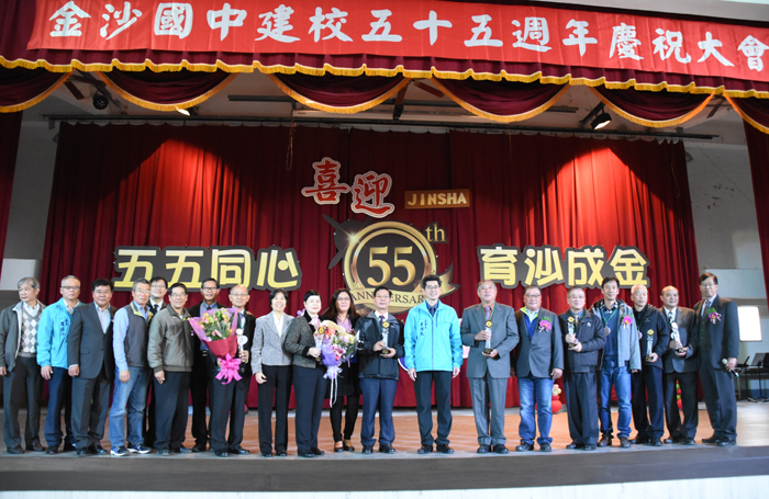 金沙國中建校五十五週年舉辦慶祝大會,經過學校、歷屆校友推薦,評選出傑出校友,並公開表揚,肯定校友在各行各業的傑出表現,作為在校學弟妹學習的標竿。第三屆校友黃拜印代表致詞時引用歐洲16歲環保少女童貝里為環保發聲,勉勵在校生,省思環境的變化,面對問題勇於克服並採取行動,堅持到底,未來亦能在社會上嶄露頭角。 金沙國中自建校30週年起,每逢五即擴大辦理校慶活動,今年逢學校建校五十五週年校慶,除了校友師生藝文作品展覽、校外鄉野踏查、學生跳繩比賽等,並公開表揚傑出校友,期藉以激發學生愛校意識,凝聚校友情誼。經過各屆校友推薦以及評選,共計有20多位校友獲獎,包括第一屆至第二十五屆以及補校一、二屆,校友們以回娘家的心情返回母校參與盛會,並自與會貴賓手中接過獎項,感謝母校和師長的培育,也祝賀母校生日快樂。 金沙國中五十五週年校慶傑出校友包括,第一屆黃龍泉、張自福。第二屆蔡清其、陳佳結。第三屆黃邦印、鄭傑民。第四屆楊傳治、張雲權。第五屆尤明灝、黃素燕。第六屆葉維敬。第七屆黃奕焮、柯景順、王清追。第八屆黃義瀚、吳則雄。第十四屆張金水、常春媚、王文琢。第十六屆李賢發。第二十屆王任瓚。第二十三屆王國泰。第二十五屆李境展。補校第1屆楊赤玉。補校第2屆王鈺筑。 黃龍泉,第一屆畢業。現任高雄市政府教育局榮譽督學。曾當選金門高中傑出校友及屏東大學傑出校友,榮膺高雄市聘任為「高雄市政府顧問」,致力於交通安全教育輔導以及深耕防災教育,多次獲獎肯定。 張自福,第一屆畢業。現任台灣金門同鄉會總會志工。公務人員生涯25年,曾獲績優役政人員。任台北縣金門同鄉會、台北市金門同鄉會秘書、總幹事一職,協助同鄉會、熱心服務鄉親,深受好評。 蔡清其,第二屆畢業,自金沙國中教師兼總務主任退休。曾榮獲全國特殊優良教師及金門縣好人好事代表。現任沙中校友會理事,瓊林社區志工,出錢出力,為校友以及社區服務。此外,個人也發揮所長,編著人文瓊林、璀璨瓊林、金門情懷、瓊林世家季刊等書刊,致力於傳承地方文史。 陳佳結,第二屆畢業,擔任公職多年,自金門農試所課長退休。當選金沙鎮第四屆、第五屆鎮長,推行金沙鎮地方建設,及為民服務,績效良好,全國績優,受到總統公開表揚。而在任農試所課長期間獎勵種植,金門高粱酒酒質得以提升,貢獻甚多,足為表率。 黃邦印,第三屆畢業,自國防部總政戰局副局長退休,軍旅生涯獲頒各種忠勤績效獎章22座。在國防部總政戰局副局長期間獲頒國安局磐石獎章,轉任社團法人軍人之友社副秘書長兼台北國軍英雄館館長,推動勞軍慰問,服務官兵、眷屬及榮民,成效良好。 鄭傑民,第三屆畢業,金門地政局局長退休。多次獲得地政績優人員獎及榮獲中央頒發全國地政貢獻獎,表現傑出。擔任公職期間推動各項地政便民服務,提升地政行政效率,深獲民眾之好評。 楊傳治,第四屆畢業,目前服務於臺北市區監理所金門監理站站長,盡職的工作態度及工作表現獲各方肯定,曾榮獲公務人員最高殊榮「模範公務人員」,亦當選為金門縣模範公務人員,接受福建省政府表揚。 張雲權,第四屆畢業,創業有成,目前是權一電有限公司負責人。103年創立嘉義市金門同鄉會,服務及凝聚嘉義地區鄉親情誼,同時加入同濟會及嘉義市張廖簡姓宗親會,服務社會及公益活動。 尤明灝,第五屆畢業,現任華南金創業投資股份有限公司副總經理。大學畢業後考上預官,服役於金門防衛部,表現優異。退役後申請至美國麻州州立大學化學系高分子研究所深造,取得雙碩士學位畢業,在美就業後十年後,放棄永久居留權回國貢獻所學,並就近服侍雙親。 黃素燕,第五屆畢業,現任航空警察局科長。曾擔任保安警察大隊副大隊長、安全檢查大隊大隊長等職,在刑事警察大隊組長期間,連續10年榮獲全國警察專業單位第一名,成效卓著。在職期間均能克盡職責,負責守紀,深獲長官肯定。 葉維敬,第六屆畢業,現任國立金門高級農工職業學校總務主任。曾獲教育部全國技藝績優教師獎及教育部教學團隊卓越銀質獎,積極輔導學生考取各項技能檢定及推甄升讀國內公私立院校,執行金門縣政府委託辦理各類工程用車基礎訓練班,積極負責,培育金門地區產業人才。 黃奕焮,第七屆畢業,現任金沙鎮民代表會代表。任職金沙鎮長期間,爭取經費改善校園環境,提升學子學習空間。擔任家長會或家長委員,熱心學校教育,關心學生各項發展,捐資興學,提供各式獎學金嘉惠母校學子。 柯景順,第七屆畢業,現任台全金屬公司總經理,曾擔任金沙國中第七屆同學會會長,台灣磁性技術協會第13屆、14屆理事。 王清追,第七屆畢業,現任金門縣信用合作社總經理。任職中華民國信用合作社期間籌備並啟用電腦化,著手彙編中小企業貸款之授信作業,規劃保管箱作業及資訊網管等因應兩岸三通之簡易外匯,工程圓滿。核准網路銀行及行動支付台灣PAY大力推廣。 黃義瀚,第八屆畢業,現任晶彩環保生技有限公司負責人。中華工專機械工程全科系第一名畢業,擔任國際獅子會區各個職務,推動三大幸福工程,捐款社服超過仟萬元,並返鄉捐贈縣政府視力檢查儀器及救護車乙部,熱心公益,快樂服務。 吳則雄,第八屆畢業,目前是長慶保全股份有限公司董事長。軍職期間功勳卓著。在華邦保全總經理任內多次協