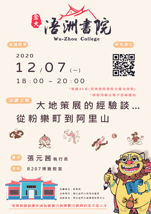 國立金門大學浯洲書院,今(七日)晚上六點的講座,邀請洛克菲勒家族基金會亞洲文化協會的台灣代表張元茜,分享她自己的策展人生。主辦單位歡迎民眾到場聽講。 金大指出,張元茜是一個具有豐富國際視野和藝術史訓練的女性策展人。年輕聰慧時曾經任職台北市立美術館,而且做到展覽組的組長。1990年代她旅居紐約和東京七年,之後回到了台灣,決定以獨立策展的生涯展開她的返鄉旅程,當時她勇敢地以無牆美術館的概念策劃了許多不但對她個人有意義,也是對「地方再造」具關鍵影響力的展覽。到現在她為台北東區開拓的「粉樂町」仍為人們樂道。當時的無牆美術館的創意,讓她獲得了亞洲文化協會台灣基金會的獎助計劃,之後也被亞洲文化協會台灣基金會延攬成為台灣的代表。 金大表示,當蔡國強在金門舉辦金門藝術節時,她帶著許多藝文同好者來參訪過金門。對於再度來到金門十分興奮,她說:金門最適合認識島嶼的天性,具地理的特殊座標,再加上豐富的歷史紋理。在保存歷史和文化再造的創造力之間一定有機會可以達成和諧,形成共生。今晚的演講,她將從洛克菲勒家族對藝術、自然、和海洋的關懷為著眼點,接著將提到她個人的人生經驗以及所策劃的展覽。 金大指出,今年受疫情影響,亞洲文化協會的受獎人無法進行人身的國際交流,在演講中張元茜女士也將分享她所主導的一系列在疫情期間如何超越人身障礙,持續進行國際藝術文化間互相溝通的可能性。