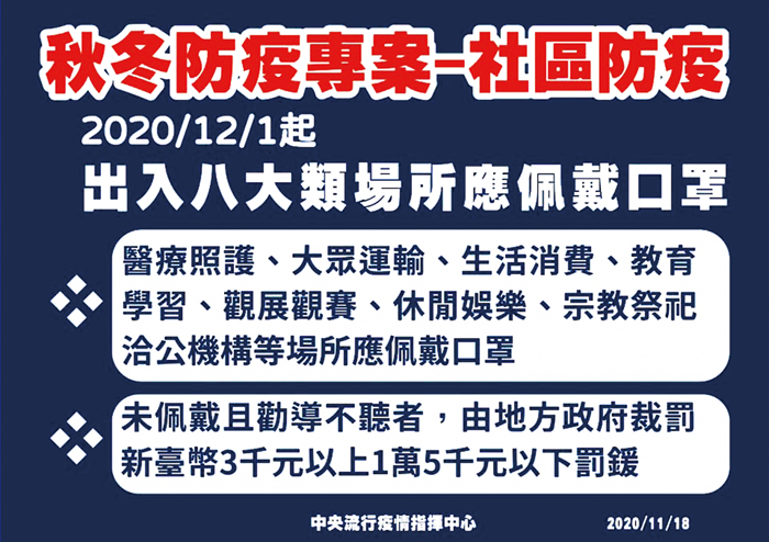 新冠肺炎疫情未退,30日我國更一口氣新增24例境外移入確診個案,是8個月內單日新增境外移入個案最高紀錄,中央流行疫情指揮中心早在日前宣布,時序進入秋冬,全球新冠肺炎疫情持續上升,多國單日確診人數屢創新高,我國境外移入個案亦有增加趨勢。為降低國內社區傳播風險,及避免造成醫療體系負擔,即起啟動「秋冬防疫專案」,強化「邊境檢疫」、「社區防疫」及「醫療應變」措施,請民眾及醫療院所配合落實。 一、邊境檢疫:所有入境及轉機旅客登機前須附3日內COVID-19核酸檢驗陰性報告。指揮中心指出,國際疫情持續嚴峻,預期今年底及明年初入境旅客數將增加,為加強防疫安全,自即日起至明(2021)年2月28日(啟程地時間),入境我國機場或經我國機場轉機的旅客,不論身分(本國籍與外國籍人士等)或來臺目的(求學、工作、外交公務)等,均應檢附「表訂登機時間前3日(工作日)內COVID-19核酸檢驗陰性報告」,始可登機來臺,並將由交通部督導各航空公司確實把關;若旅客抵臺後發現檢驗報告不實,或拒絕、規避、妨礙相關檢疫措施,得依傳染病防治法第58條及69條規定,處新臺幣1萬至15萬元罰鍰。檢驗報告不實部分,亦將追究偽造文書印文罪之刑責。 二、社區防疫:出入八大類場所應佩戴口罩,經勸導不聽者依法開罰。指揮中心表示,考量秋冬時期除新冠肺炎疫情外,也有多種呼吸道傳染病盛行,都會加重醫療體系的負荷與調度壓力,為了提高民眾於高感染傳播風險場所佩戴口罩的遵循度,以降低呼吸道傳染病的感染與傳播,及避免過度耗用醫療資源,即日起,強制要求民眾進入「醫療照護、大眾運輸、生活消費、教育學習、觀展觀賽、休閒娛樂、宗教祭祀、洽公」等八大類場所應佩戴口罩。未依規定佩戴口罩,經勸導不聽者,將依違反傳染病防治法第37條第1項第6款規定,由地方政府裁罰新臺幣3千元以上1萬5千元以下罰鍰。 指揮中心說明,上述場所因具有「不易保持社交距離」,或會「近距離接觸不特定對象(不認識的人)」的特性,有較高的感染與傳播風險,因此要求進入該類場所活動的民眾佩戴口罩,除了有助於防範新冠肺炎外,對於其他各類經由飛沫、空氣傳播之疾病也能發揮防護效果。如果在上述場所內有飲食的需求,在與不特定對象保持社交距離或有適當阻隔設備的前提下,可在飲食期間暫時取下口罩。 指揮中心表示,至於人潮聚集的戶外場所(如戶外風景區、遊樂園、夜市、傳統市場等),或是於戶外進行的公眾集會活動(如遊行、遶境、跨年晚會等),建議業者或場所管理單位採用「人數總量管制」方式進行管控,使民眾在場所或活動中能持續、有效地保持社交距離,並請民眾如有發燒或呼吸道症狀等身體不適時,應避免前往上述場所,以及在不能保持社交距離時自主戴上口罩。也提醒公眾集會活動主辦單位應參考「新冠肺炎因應指引:公眾集會」,評估風險及制定相關防疫應變計畫,並盡可能落實實名制及佩戴口罩。 三、醫療應變:加強通報採檢,訂定獎勵指標。指揮中心表示,為防範國內醫療體系於秋冬季面臨武漢肺炎及流感疫情之雙重負擔,秋冬專案中已將加強通報採檢列為重要防疫策略,並研擬四大措施,包括醫療院所落實法定傳染病通報義務;訂定「加強門診與急診社區感染肺炎病人篩檢」、「加強住院病人篩檢」及「強化醫療照護人員健康監測」等獎勵通報採檢指標;透過健保系統提醒加強通報採檢;修訂無新冠肺炎相關症狀居家隔離、檢疫者之採檢及相關處理流程。臨床醫師應提高警覺加強通報採檢,強化社區監測疑似個案通報或轉介;同時並請地方政府持續督導所轄醫療院所,鞏固醫療院所防疫陣線。 指揮中心指出,國際疫情持續嚴峻,臺灣防疫得以有效控制,有賴邊境檢疫人員、醫療院所、醫療照護人員持續堅守崗位,以及政府、民間攜手合作,守護國人健康;請民眾持續配合政府各項防疫措施,共同確保這得來不易的防疫成果。