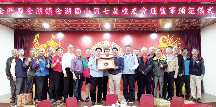 金湖國小校友會辦理第7屆新任理事長及理監事頒證聯誼餐會,由金湖鎮長陳文顧連任第7屆理事長,許多新科理監事及校友皆出席盛會,縣府社會處長董燊、民政處長蔡西湖皆到場恭賀湖小校友會新任理監事,期勉第7屆校友會在陳文顧理事長帶領下,對學校教育提供更強而有力的支持。 金湖國小校友會第7屆當選理事共15名,陳文顧、陳賢德、陳進源、李孝光、李仁傳為常務理事,黃光漢、李錫源、李清林、蔡壬癸、陳嘉來、陳金贊、陳文傑、王惟立、林中捷、陳錦偉為理事。監事當選5名,蔡西湖為常務監事,李錫來、李自然、陳家興、陳天溫為監事。其中增置總幹事1名,由蔡顯慶擔任、副總幹事3名,由吳志成、陳文開、陳錦章三位里長擔任。陳福海、陳恩賜、陳世保、周子傑等榮膺榮譽理事長,林淵正、何國興、陳自強、陳宗新、黃秀珍、蔡育仁等榮膺榮譽理事。會議中同時頒贈榮譽理事長及榮譽理事聘書。 金湖國小校友會成立於民國91年10月,歷經6屆、4位理事長。在前6屆理事長帶領下,會員已成長至66名。其中不乏學校教師同仁,充分展現學校與校友一家親的精神。新任理事長陳文顧表示,第7屆湖小校友會成立後,將持續秉持做為學校的強力後盾為目標,希望大家繼續出錢出力支持學校。 金湖國小校長陳為信對湖小校友會大力的支持學校表達感謝,並提到明年適逢70週年校慶,希望大家踴躍推薦傑出校友當學弟妹們的楷模,也歡迎校友們回娘家。校友會與家長會是學校蛻變中持續成長的兩大後盾,期盼未來學校日益精進,讓湖小校友以母校為榮。