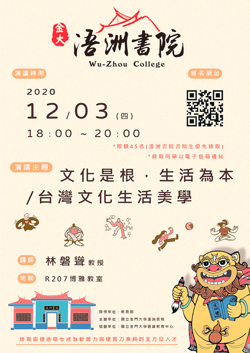 國立金門大學浯洲書院今(三日)晚間六時在該校R207博雅教室辦理一場講座,邀請國立臺灣師範大學設計學系教授、美術系主任暨美術研究所所長林磐聳演講,主題為「文化是根,生活為本:台灣文化創意產業與生活美學」。 該講座限額45名,浯洲書院書院生優先錄取,現場並開放旁聽,講師為林磐聳,國立臺灣師範大學設計學系教授、美術系主任暨美術研究所所長(2005-2007)、國立臺灣師範大學副校長(2010-2011)、榮獲第十一屆國家文藝獎美術類獎、日本出版「New DECOMAS」亞洲十二位CI設計名家、國內外重要設計競賽評審。 主辦單位指出,台灣文化創意產業的根本,可以「文化是根,生活為本」八個字加以概括說明其核心價值與資源特色;主要是泛指在台灣衣食住行育樂等不同的生活領域,都能挖掘出各自內在深層的文化意涵,並將傳統文化透過現代創意轉換應用在生活層面;這正可說明台灣的「文化創意產業」與大陸的「文化產業」相互之間的差異,其中在於台灣不同產業面對市場的競爭都非常地重視「文化論述」與「創意加值」,形成「會講故事」與「蠻有意思」的雙重意義;台灣文化創意產業之所以能夠在兩岸四地或是全球華人社群具有獨特之處,其中的關鍵是在「文化」(傳統)與「產業」(市場)之間融合了「創意」(現代)的加值;因此在探討產業創新的轉型發展之際,培養「創意思維」就成為產業創新發展的關鍵。 引進「創意思維」必然會面對「獨特性」與「可行性」的差異化程度,當然更需要面對消費者的質疑。因此從產銷供需的兩個對立面向而言,盡管企業強化創新思維,引進創意融入產品創新與服務設計;但是提供產品與服務者必須掌握市場消費端受眾的行為模式與生活品味,也就是消費者的生活美學必需要加以提昇,才能擴大市場的需求。因此政府應該投入政策資源,並且積極進行環境整備,才能培養更高質量的創意消費族群,進而影響到社會轉型升級。