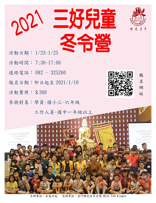 「疫情之下辦活動、不畏艱難行三好」,由佛光山金蓮淨苑主辦、金門佛光青年分團承辦的「2021年三好兒童冬令營(航空體驗營)」,預定在110年元月23日開營展開連3天活動,即日起開放報名,額滿為止,永勤法師歡迎家長鼓勵小朋友參加營隊,讓小朋友渡過充實的寒假假期。洽詢電話:082-325260、325404。 這項冬令營,活動舉辦日期自元月23日起至25日止。招生對象:學員國小三年級至六年級,隊輔國中以上。活動地點在佛光山金蓮淨苑。 這項由佛光山金蓮淨苑與金門佛光青年團一同合作的航空體驗營,活動內容包括一系列偽出國情境的模擬,如從列印登機證開始、登機前廣播、機上安全宣導與餐點(各國經典美食)、伴手禮製作、彈力造飛機、小沙彌環遊世界等等都將照本宣科,希望讓小朋友都能感受到出國的氛圍,從活動中落實三好並發現人間的美好。