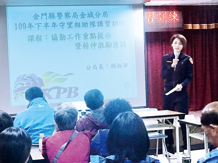 金門縣警局為落實推動守望相助巡守工作,金城分局24日晚間特別邀集轄內5支社區守望相助隊,在該局辦理109年下半年度守望相助隊訓練,包括安排警察局總教官教授防身術,藉以強化隊員協勤時的自我防衛能力。學員對簡單擒拿手法能產生強大制服力,都感到新鮮驚奇,學習反應也加倍熱烈,來自小金門的東坑隊員更歡欣表示,不枉他們特意搭船前來學習,真的是收穫滿滿。 由於近期校園安全引發社會大眾關注,新任分局長胡淑淨除向大家說明轄區治安狀況外,也特別請各守望相助隊協助強化校園周邊安全巡守,發現可疑人、事、物,能立即通報警方處理,提供民眾無恐懼的生活環境。另外她也期待大家能成為警方眼線的延伸,關注深夜時段改裝車輛飆車,產生噪音、變更燈光等危害用路人安全情事,共同遏止飆車歪風,防止憾事發生。 胡淑淨表示,校園安全一直是分局重點工作之一,為維護校園安全,除全面加強校園周邊監視器及照明設置,並對轄內各級學校進行校園安全評估檢測,加強校園周邊巡邏守望勤務,與學校建立密切合作的聯繫管道;對交安方面的維護也是不遺餘力,該分局目前每週皆不定期在轄內重要路段及改裝車輛易聚集的熱點,規劃警力強力攔檢,鎖定非法改裝、噪音擾人以及危險駕車之車輛,主動攔查取締,希望能有效維護用路人安全。