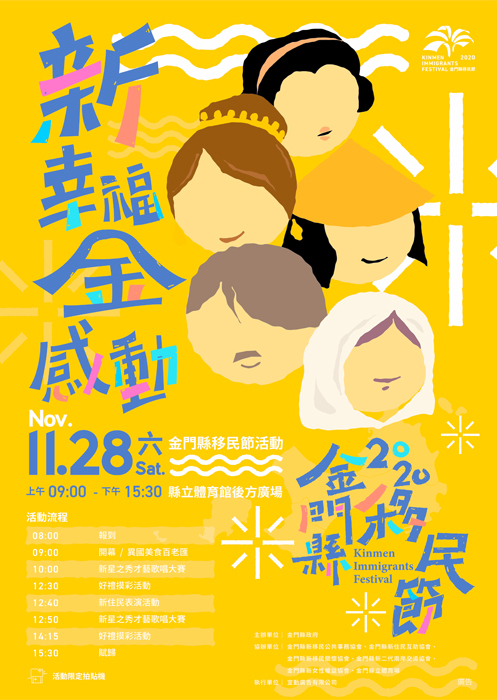 「新幸福‧金感動-2020金門縣移民節」即將在本週六(28日)上午9時起在金門縣立體育館後廣場熱鬧登場!每年所舉辦的「金門縣移民節」皆廣受新移民喜愛,今年特別將活動推至戶外擴大舉辦,除了有新星之秀才藝歌藝競賽,由新住民朋友們展現熱力演出,並鼓勵新移民將家鄉特色菜餚於活動市集推出,不只一解新移民們的思鄉之愁,也讓金門鄉親大飽口福。縣長楊鎮浯歡迎鄉親朋友們一同來為參賽者加油打氣,並至現場享受新移民的文化風情。 縣府社會處表示,本次預計將有數百位新移民歡慶這場異國派對,當日除了集結各國新移民及在地品牌的特色小吃及選物,還推出活動限定的「異國料理拿手菜」,打造金門最high的戶外美食派對!此次移民節共有六大看點,集結各國特色美食、異國拍貼機、新星女神異國服飾走秀、親子趣味闖關、新星之秀歌唱及才藝大賽,吃喝玩樂一站滿足,就是要讓鄉親在移民節這天感受節慶的熱鬧氣氛。 除了有重頭戲六大主題之外,本次活動也推出現場「不限金額消費即贈摸彩券」的加碼活動,將有switch 1台、國際牌烤箱2台、知名品牌空氣清淨機1台等精美彩品。只要入場至攤商消費,不限金額,即可至服務台兌換摸彩券,每人限領1張,數量有限,兌完為止。活動現場也將贈送移民節特製限量「紋身貼紙」,每人限取1張。此外也準備限量的「手拿活動加油棒」,以及「卡通氣球」(限12歲以下兒童領取)。 活動時間將從上午9時持續至下午4時,活動期間浯江北堤路部分路段單向通車,煩請用路人及鄉親配合當日交通指揮。
