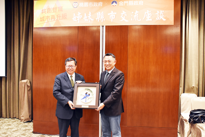 金門縣與桃園市互為「姊妹縣市」,桃園市長鄭文燦昨(26)日率領市政團隊蒞臨金門交流,並展開縣市交流座談,金門縣長楊鎮浯提出智慧城市、文藝展覽、資源循環及金酒銷售等交流議題,桃園市長鄭文燦提出桃園金門日、強化旅遊合作及互設文藝館舍等交流議題,期能透過雙方加強跨域合作,協助本縣提升城市治理能量,鄭文燦允諾全力協助。 兩縣市座談會在昨日下午召開,桃園市政府及金門縣政府各由市長及縣長率相關單位主官出席,各議題經充分討論交流,鄭文燦及楊鎮浯對於雙方交流議題均樂觀其成。 金門縣長楊鎮浯與桃園市長鄭文燦會面並致歡迎詞,楊鎮浯表示,金門做一個小老弟,在政府施政、鄉親照顧,還有很多可以向桃園學習的。楊鎮浯特別感謝桃園市政府對金門鄉親的照顧,桃園有很多金門鄉親居住,受到桃園市政府很多協助。另外,楊鎮浯也提到,今年疫情影響,對於離島來說,鄉親返國之後要返回離島,在台灣必須要有防疫旅館,這個部分也受到桃園市政府的協助,讓金門鄉親返抵國門的時候,有比較好的安排。 楊鎮浯指出,桃園市乃北台灣農工商綜合大城市,幅員廣大,城市發展繁榮,在智慧城市、文化藝術、資源循環等優秀成績更是值得金門學習。楊鎮浯也請縣府團隊儘速與桃園市政府對口單位展開合作進程規劃,積極落實本次座談共識項目,此外,也鼓勵同仁多向桃園市政府學習,汲取經驗,促進地方發展。 楊鎮浯強調,金門就是國門,桃園也是國門,相信大國門桃園、小國門金門,這兩個國門之間,一定有很多可以進一步合作的地方,也希望透過鄭市長這次來,讓我們在台灣本島的行政體系夥伴更了解金門所面臨的處境、需要克服的挑戰以及需要的協助,能夠協助金門往後整個的發展過程能夠更順遂。 鄭文燦受訪時談到座談內容,他說,桃園市民卡跟金門縣民卡能夠互相交流,桃園推出比較多的特約商店包括行動支付、一些創新應用,因為系統已經開發完成,希望能跟縣民卡互相搭接,讓縣民卡也更好用。鄭文燦說,桃園已經完成八二三砲戰紀念館,想跟金門縣政府合作設一個金門文化館,許多有金門魅力的展覽可以在桃園看得到,尤其桃園的金門鄉親有6萬人以上,若加上第二代,可能有8萬人,希望能夠在金門文化館看到許多金門好的展覽。鄭文燦提到觀光交流,桃園有大溪老街,金門有洋樓,希望兩邊的觀光旅遊業者能夠互相拉抬、互相行銷。鄭文燦也說,有關兩縣市展覽互相借展,金門好的展覽能夠到桃園來展出,桃園好的展覽也能夠到金門來,讓兩邊的展覽資源都可以共享。 鄭文燦表示,楊鎮浯縣長向行政院提出很多重大建設計畫,包括四個港的改造計畫,興建經費高達將近60億元,讓整個港埠升級,其中包括服務水準,有助未來小三通或者是跨境電商的推動。鄭文燦也提到,楊縣長在疫後振興加碼地方振興券,又加碼防疫旅遊,創造產值很高,交通部評定為防疫旅遊第4名、56億的產值,另外三倍券加上地方振興券提高10億的消費量,金門因為少了小三通以後能夠有這個表現,真的很不容易,也支撐了金門的經濟。鄭文燦讚許,金門目前用心發展包括親子館、共融式公園、各托育的公共化及更多的專班,看到金門也用這個方式在留住年輕人的心,讓年輕人在金門可以負擔小一點、夢想大一點,這是他來金門看到覺得值得學習之處。 金門縣與桃園市在1996年由當時的金門縣長陳水在和桃園縣長劉邦友締結為「兄弟縣」,甚至將金門往來機場的主要幹道命名為「桃園路」做紀念。目前金門旅台鄉親約40萬人,有不少設籍於桃園市平鎮、中壢、龍潭、龍岡一帶。在桃園市有「金門日」,每年雙方都派員參加,交流十分熱絡。本次桃園市政府交流行程,除了與縣府召開交流座談外,也考察金門大橋、金門三創平臺,並實際走訪烈嶼,參訪白色秘境藝術季及西方一條街,另也安排金門大學演講及赴金防部慰問桃園市籍在金門服役的役男。
