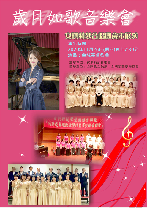 記者詹宗翰/金城報導 成立已兩年多的金門安琪莉莎合唱團將在26日感恩節,在金城基督教會舉辦歲末展演「歲月如歌音樂會」,演唱耳熟能詳的多首國台語、客家歌謠和原住民歌曲,還有充滿異國風味的歌曲,歡迎鄉親到場聆賞。 安琪莉莎合唱團於2018年3月在金門成立,目的在紀念早逝的女孩莉莎天使(Angel Lisa)劉佳琪。合唱團現有20名成員,包括醫師、中小學教師、校長、退休人士、個人企業主、家庭主婦等。 合唱團特聘台灣專任指揮林慧伶每月跨海前來傳授不同合唱專業技能。東吳大學音樂系畢業的林慧伶專攻合唱指揮,任教多年,現為台北市政府合唱團、耕莘文教院等合唱團指揮。 安琪莉莎具代表性演出作品有,2018年終展演「海角七號組曲等、2019年古寧頭聖戰60週年紀念「虎賁禮贊」的「回憶」等,以及和2019年「平安夜頌平安」的「月夜愁」等台灣歌謠。在才剛落幕的金城基督教會120週年音樂會中,安琪莉莎合唱團也演唱了「月亮代表我的心」等歌曲。 26日的歲末展演,安琪莉莎將帶來國語經典「長空下的獨白」和「我的心裡沒有他」、獨唱曾瑀涵的「是愛」和孔繁鈞的「船歌」;二重唱由許瑞芬與陳世聰夫婦合唱「認識你真好」,還有女聲合唱三部「讀書郎」。原住民及鄉土歌曲有魯凱族的「鬼湖之戀」,以及閩南語的「月夜愁」、客家風情的「天空落水」和「桃花開」。此外,還有異國情調的義大利語Ecco Mormorar L'onde、拉丁語Dona Nobis Pacem和日語「花」。 合唱團代理團長洪鳳英表示,由曲目可知安琪莉莎合唱團演唱作品多元,歌曲要求由淺至深涵蓋頗廣,也相對提升演唱者的素質。洪鳳英說,安琪莉莎合唱團,不只在金門獨具風範,在兩岸合唱藝術以及文化交流上也深入人心,傳遞光和熱。歡迎喜愛歌唱、渴望透過音樂洗滌心靈的朋友,26日晚上7時30分在金門基督教金城教會,來聆聽一場美聲饗宴,見證安琪莉莎合唱團的成長。