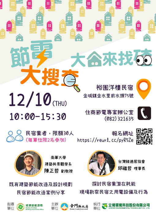 金門以觀光立縣,旅客為金門帶來許多周邊經濟發展。近年來,民宿業大舉興起,許多具備在地特色的建築,儼然成為金門民宿一大特色與賣點,無形中增加住宅對於電力的需求。因此,金門縣政府建設處將針對民宿業者辦理一場次節電教育宣導課程,即日起開始線上報名,以「節電大搜查‧大家來找碴」作為課程主題,傳達服務業節電觀念及降低尖峰負載作為,藉以減少金門縣住商部門用電需求,而帶動民宿業節電風氣,不僅節省民宿業者用電成本,也能向遊客傳達節能減碳及節約能源等觀念,並實踐保護地球的行動。 金門縣政府建設處表示,此次規劃「節電大搜查‧大家來找碴」的節能課程,將於十二月十日上午十時至下午三時三十分,於裕園洋樓民宿(金門縣金城鎮金水里前水頭75號)辦理,上課對象鎖定民宿業者,僅有三十個名額(每單位至多二位),全程免費報名從速,以免向隅。 建設處表示,「節電大搜查‧ 大家來找碴」節能課程,特邀台灣綠適居協會理事長邱繼哲、南華大學建築與景觀學系副教授陳正哲共同擔任講師,一起宣導用電習慣及節能節電。住的舒適、健康又安全已是現代人們基本需求,並透過課程帶領學員一同發掘民宿既有建築之節能改造空間及設計規劃,如何在既有建築物內兼顧節電之手法增進居住環境品質,將綠色節電觀念落實在生活中。 另,其課程將探討民宿裡有哪些浪費電力的設備及行為,屆時講師將帶領學員實際檢視民宿的電力設備及用電行為,攜手找出潛在節電空間,使用最少的能源及資源,提高生活品質又能兼愛這片土地。 建設處表示,「節電大搜查‧ 大家來找碴」節能課程一律採網路報名,請逕洽https:/ /reurl.cc/pyR5Ze,報名完成後將由節電專案辦公室通知報名成功資訊,課程當天請依據報名序號至現場完成簽到。如有任何課程疑問可於週一至週五上班時間撥打服務專線:082-321635,將有專人為您說明。