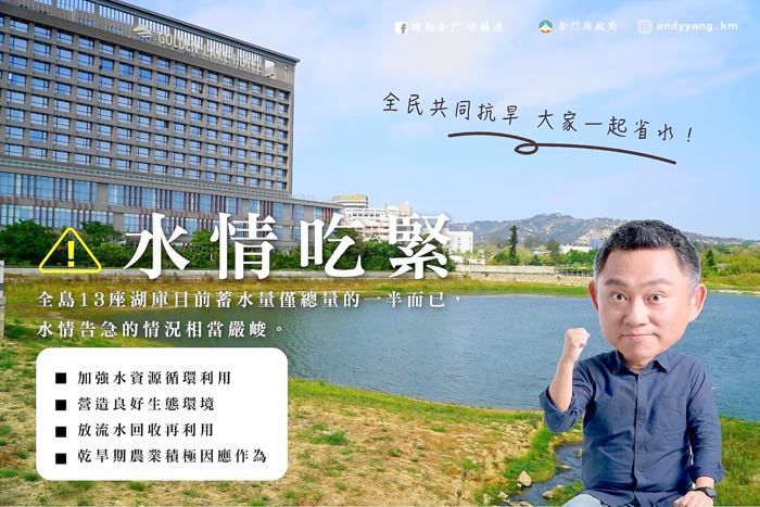 金門水情吃緊,自來水廠統計到今年11月初,年降雨量僅約446毫米,不及年平均的一半,受惠大陸供水支援,大、小金門生活用水雖然尚無虞匱乏,但面對嚴峻告急的水情,縣長楊鎮浯昨特別透過〈躍動金門〉個人粉專,呼籲全民共同抗旱,大家一起來省水,珍惜大自然有限的水資源。 金門氣象站最近一項統計顯示,金門年平均降雨量約1000毫米,2016降雨量高達1873毫米,寫下該站2004年建站以來的最高紀錄。但今年到11月降雨量卻僅有446毫米左右,若年底前無顯著降雨,將創下歷史新低紀錄。據了解金門年降雨量次低紀錄是2017年的649.2毫米。 金門縣自來水廠也說明,目前地區13座湖庫含大金門10座、小金門3座,滿水位總蓄水量約為565萬噸,目前蓄水量約為310萬噸(大、小金門各約281萬及29萬噸),僅有設計總庫容量的54.9%左右。 楊鎮浯昨在臉書寫道,「週六的Hope野餐迎來久違的降雨,天空飄著細雨澆不熄熱情民眾,一來是因疫情悶壞了;二來也是因大地快乾枯了!自來水廠評估,全島13座湖庫目前蓄水量僅總量的一半而已,水情告急的情況相當嚴峻。」 他也指出,「10月累積雨量僅0.5毫米;受惠於大陸供水的支援,民生用水正常供給,讓地區家家戶戶用水不虞匱乏,也或許因此降低了大家的警覺性,他要特別呼籲鄉親一起來省水抗旱。」 楊鎮浯強調,這段時間自來水廠同仁也沒閒著,除了加強水資源循環利用,營造良好生態環境,也積極爭取到經濟部水利署補助,用以改善金沙、田浦、瓊林水庫環湖壩堤道路及周邊蓄水設施;此外,為讓水資源循環永續利用,自來水廠也致力將地區五座污水廠所放流的水回收再利用,種種作為就是希望讓珍貴的水資源能發揮最大效益。 至於農業灌溉部分,楊鎮浯指示,因應極端氣候及雨量未來整體農業水資源利用,在明年雨季來臨前應加強農塘浚深,並運用可利用的地方來擴大儲水。且縣府也已函文各鄉鎮公所進行調查,回報可再浚深之農塘,私有農塘民眾如有意願,也可提供公用同意書予公所納入農塘浚深,相關工程經費將優先認定,如有不足將追加或動用預備金來支應,以減緩極端氣候對於金門農作影響。 另透過適時開放湖庫取水灌溉、爭取中央天然災害救助、調整農業經營等種種作為,楊鎮浯強調,縣府團隊將攜手農友,節水之外,也會運用更有效的方式,和大家一起度過艱困的乾旱期。 此外,自來水廠也說明,金門雖有大陸水源支應,但該廠仍將持續做好自有水源的整備應變,持續強化及改善自有水源,包括各湖庫的整治與改善及調度能力,其中13座湖庫已完成淤積測量,淤積較為嚴重的分別為田浦、金沙水庫及蘭湖等水庫,目前經濟部水利署已核定分年分期計畫,在109~112年預計投入2.2億餘元,進行相關湖庫整治及清淤與調度強化工作,其中清淤項目預期可增加庫容約7萬餘噸,同時針對太湖等水位偏低之湖庫,趁這次機會進場清除底泥,以改善原水水質。 另在備援備載能力的強化,該廠積極爭取中央補助辦理「金東地區湖庫導水管改善工程」,希望藉由原水輸送管線之建置與連通,強化各湖庫之原水調度能力,同時持續將水源抽送至瓊林、蘭湖及擎天與山西等水庫進行蓄存,提昇地區自有湖庫水源之安全存量與各水庫間之調度與支援能力。 而為讓水資源循環永續利用,水廠也致力將地區五座污水廠所放流的水回收進行再利用,希望能讓珍貴的水資源能發揮最大效益。