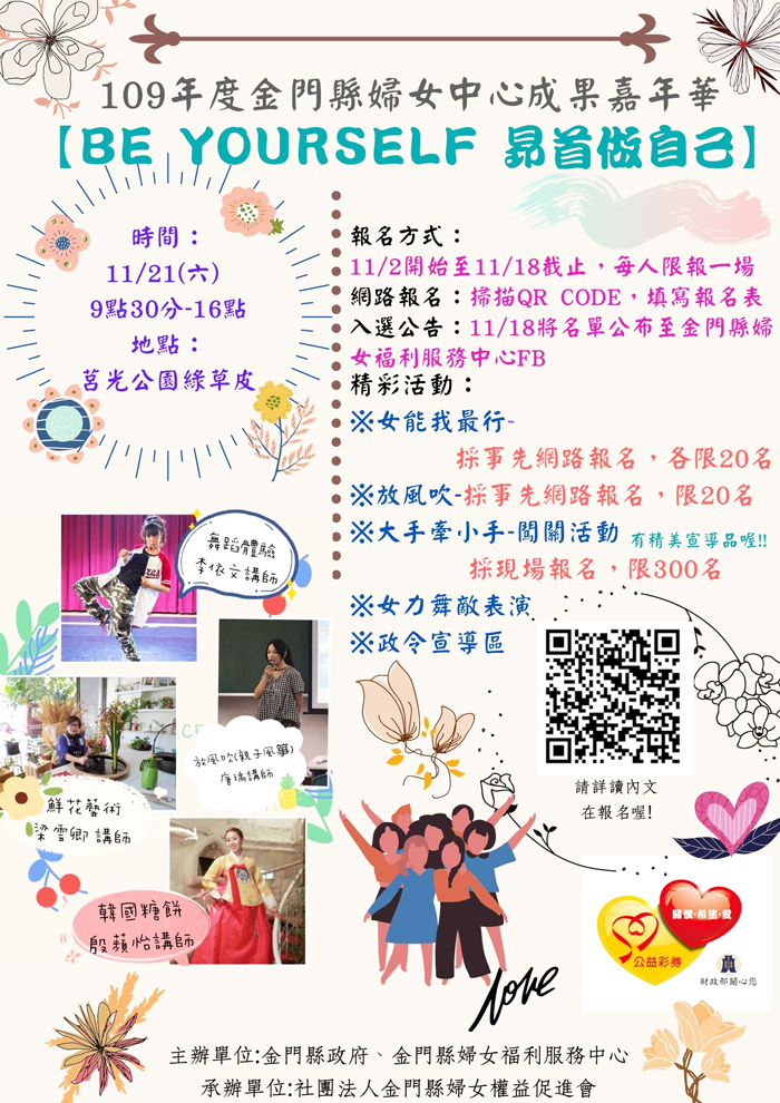 109年度婦女福利服務中心成果嘉年華「BE YOURSELF昂首做自己」活動,由金門縣政府、金門縣婦女福利服務中心主辦,委託社團法人金門縣婦女權益促進會承辦,公益彩券盈餘補助。婦女中心成果展內容豐富多元,除了有靜態的年度作品展示、亦規劃動態手作及體驗活動,並且邀請了21個單位到場宣導。現場還有闖關活動換美食券。目前舞蹈體驗活動尚有名額,報名參加者將會給予精美宣導品,歡迎鄉親掃描QR CODE(如圖)事先完成網路報名,額滿截止。 金門縣婦女福利服務中心表示,活動訂於十一月二十一日假金城鎮莒光湖畔長頸鹿遊樂園大草原登場,於九時二十分開幕,十時起為婦女才藝展現。現場除了各項活動成果,亦有闖關活動、宣導活動及舞蹈團體、才藝團體,並且有手作、體驗(須上網事先報名),歡迎民眾到場參與。