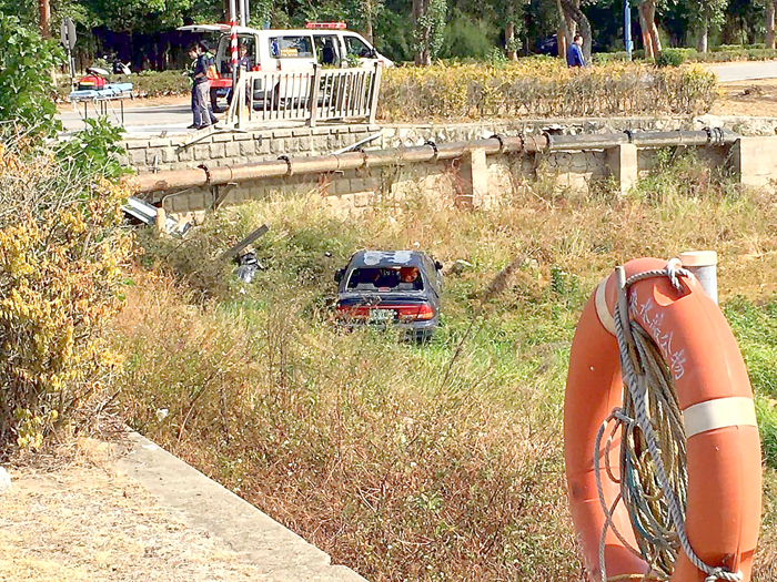 昨日中午11時25分左右,在金湖鎮士校路太湖二橋路口,發生一起一輛汽車衝入太湖內的交通事故,所幸本起事故並未造成任何人員傷亡,具體的肇事原因,有待金湖分局的調查與判定。 金湖分局表示,本起事故為一部汽車沿士校路由小巨蛋往金門高職,行駛至太湖二橋路口時,為閃避一部由南雄圓環方向駛出的汽車,不慎衝出路外掉落至太湖內;雙方駕駛皆無酒後駕車的情形。 據了解,該事故為一名在水頭碼頭工作的林姓民眾駕駛轎車行經太湖二橋時,為閃避另一輛轎車而失控衝破柵欄掉落約2公尺高的湖畔,碰巧最近太湖嚴重缺水、湖邊乾涸見底,車子雖然受損,但人員安然無恙。