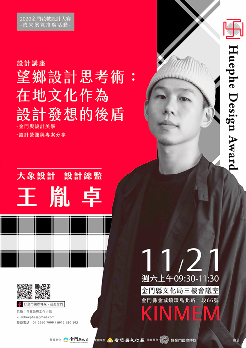 2020金門花帔設計大賽暨推廣活動—設計講座(見圖),11月21日上午於文化局三樓會議室舉辦,金門場開放報名,歡迎對設計、文創、地方創生有興趣的朋友,一起來報名參與。 金門縣文化局將於11月21日早上9點30分於文化局三樓會議室舉辦2020金門花帔設計大賽推廣活動—設計講座,為推廣金門花帔文化、增進文創與設計的力量及產能,特別邀請致力於金門美學與設計的大象設計設計總監王胤卓,分享設計美學、發想與收斂的技巧、整合性的設計思考。王胤卓為出生於金門,成長於金門的平面設計師,執行過多項平面設計專案,將以「忘鄉設計思考術:在地文化做為設計發想的後盾」為題,分享這幾年精彩的設計專案經驗,包含金門醫院、在珠山聚落所舉辦的土豆音樂祭、後浦泡茶間及「來去總統住一晚」室內設計與體驗等更多有趣的專案分享。 金門縣文化局歡迎對設計、文創、地方創生有興趣的朋友,一起來報名參與。本活動免費報名,詳情活動資訊請上「好金門國際傳媒」報名參加,參加民眾即贈送花帔文創品乙份,數量有限,贈完為止。報名連結https://forms.gle/VXHzLJYbTvwa7ZmMA。
